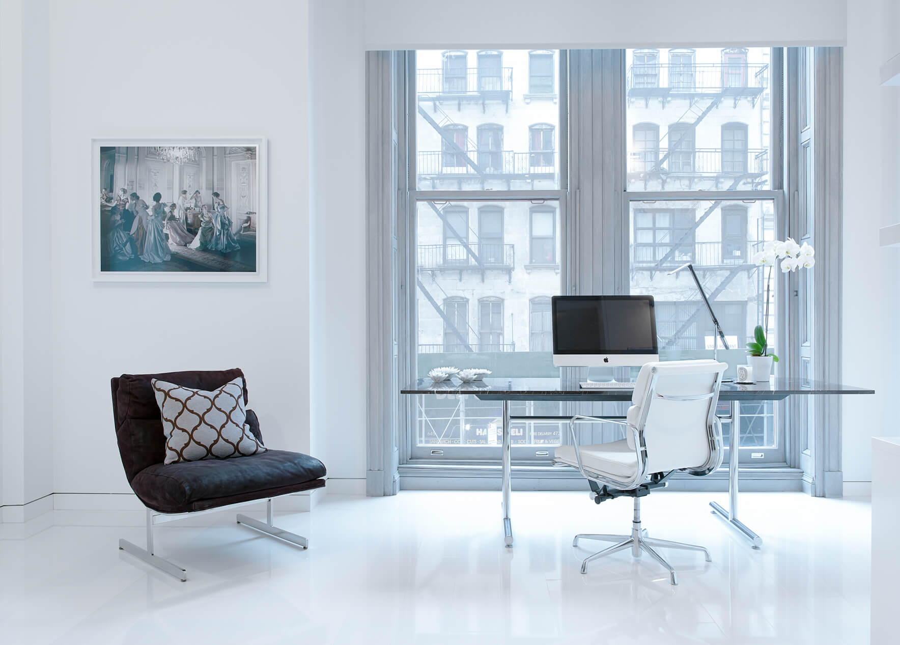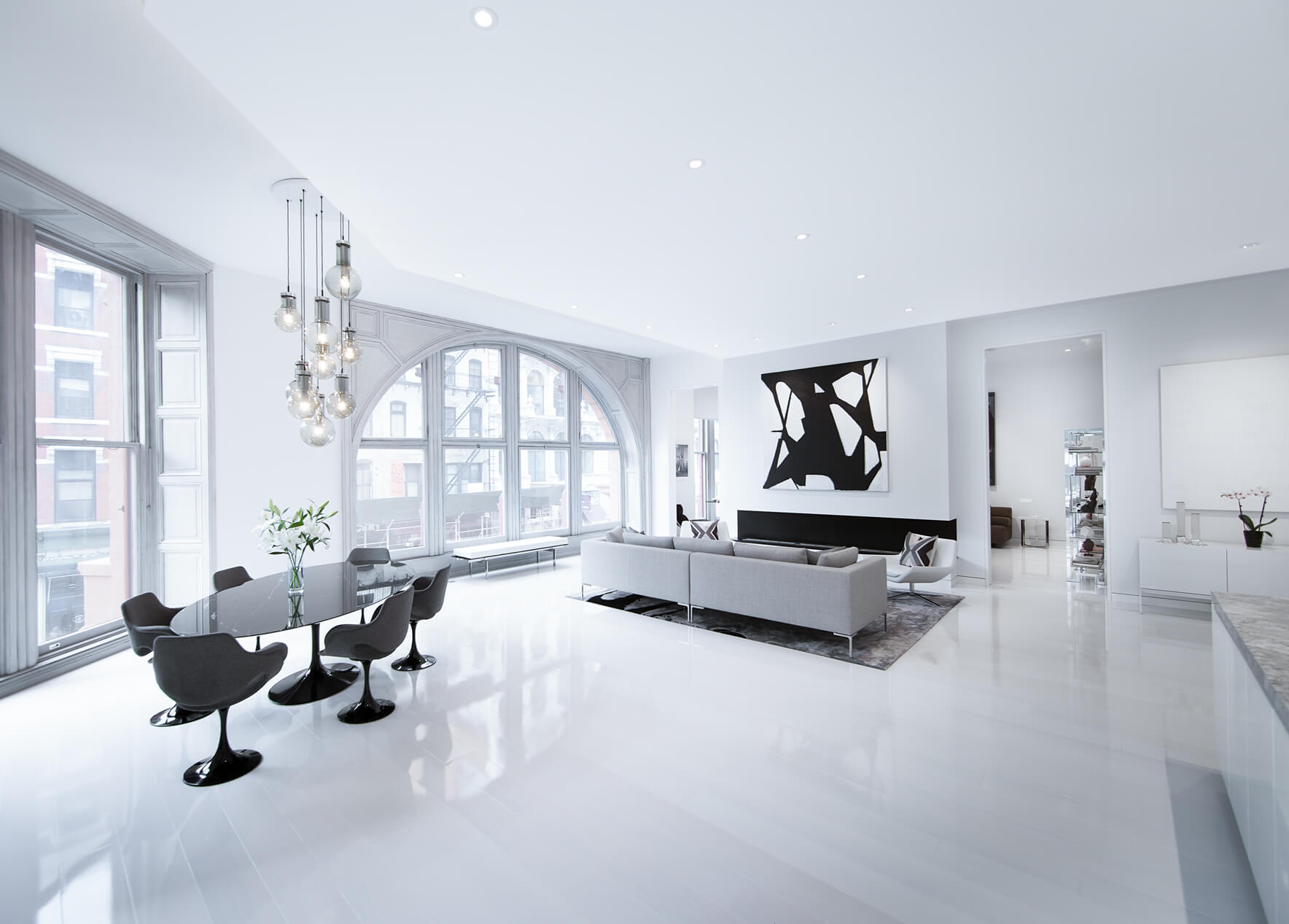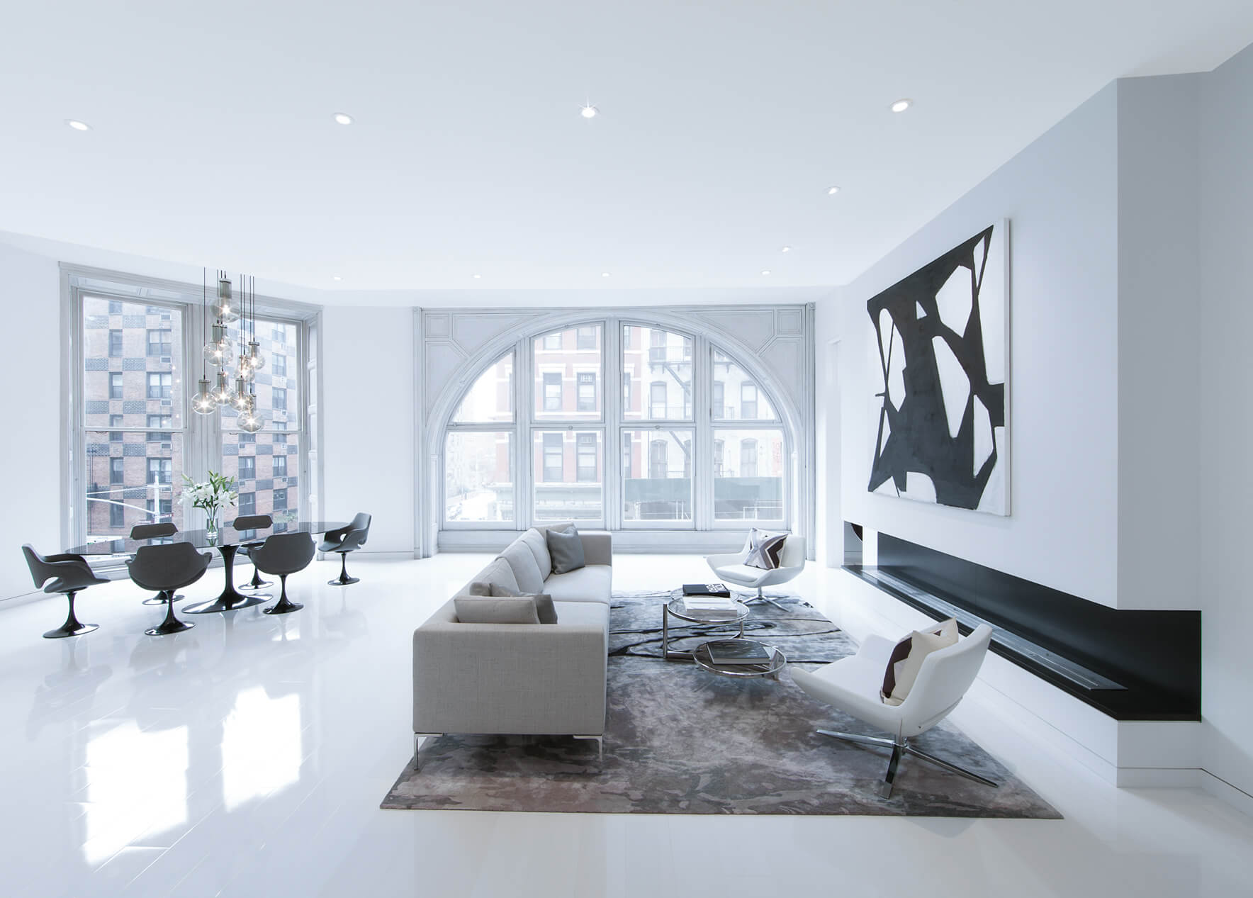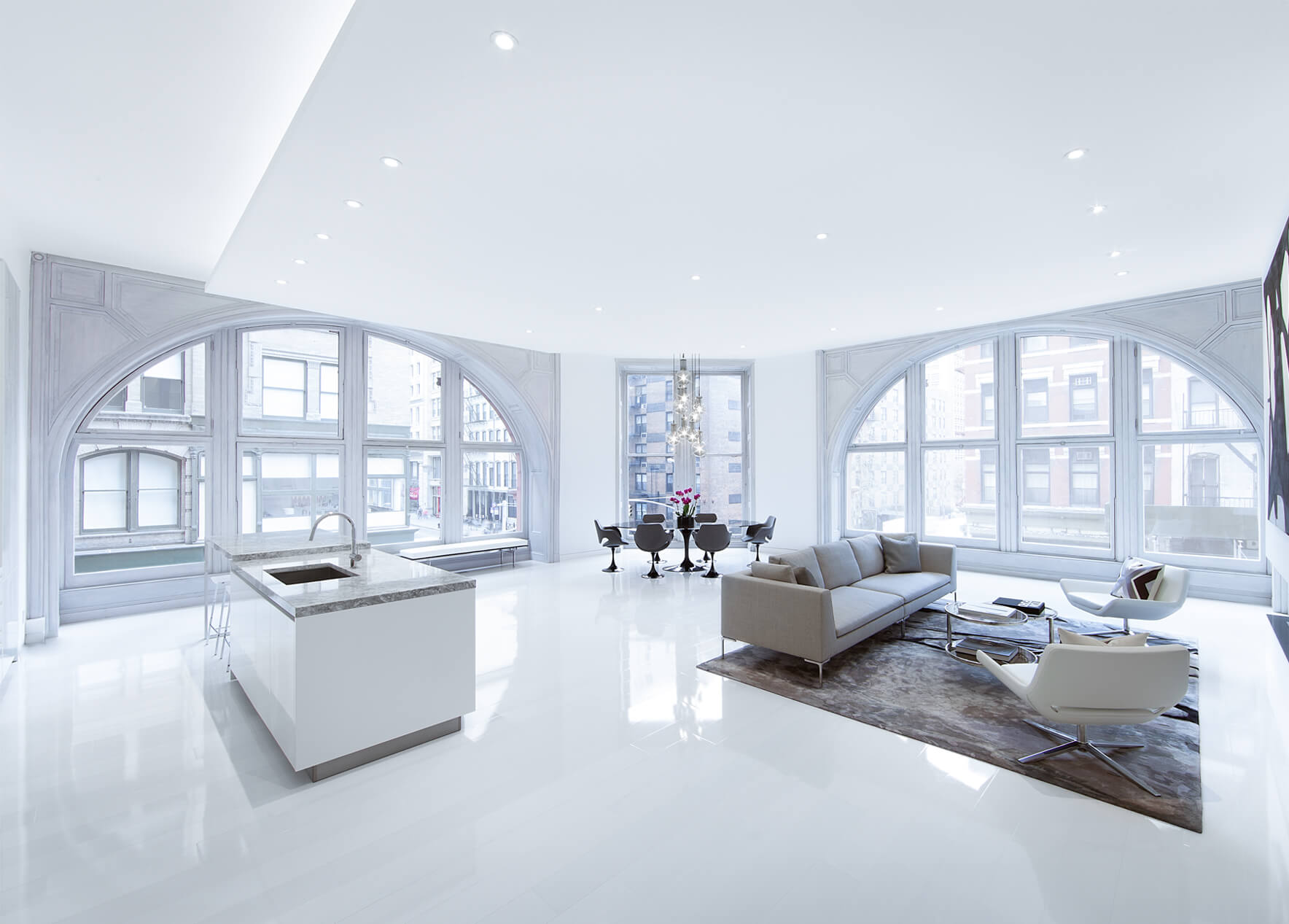 The main focus in the project was to restore the historic elements while creating a sleek 21st century environment for the modern day city dweller. The apartment required an entire gut renovation, demolishing the existing mezzanine spaces and creating a whole new layout. The visual feast of the exterior detailing on the Broadway and Bleecker Street facades translates into the loft’s original floor to ceiling wood arched windows. These were painstakingly restored whilst the 13’ high ceilings were reclaimed throughout. With these moves, DHD aimed to celebrate the building’s history and to bring the focus of the spaces back to loft’s incredible street views.