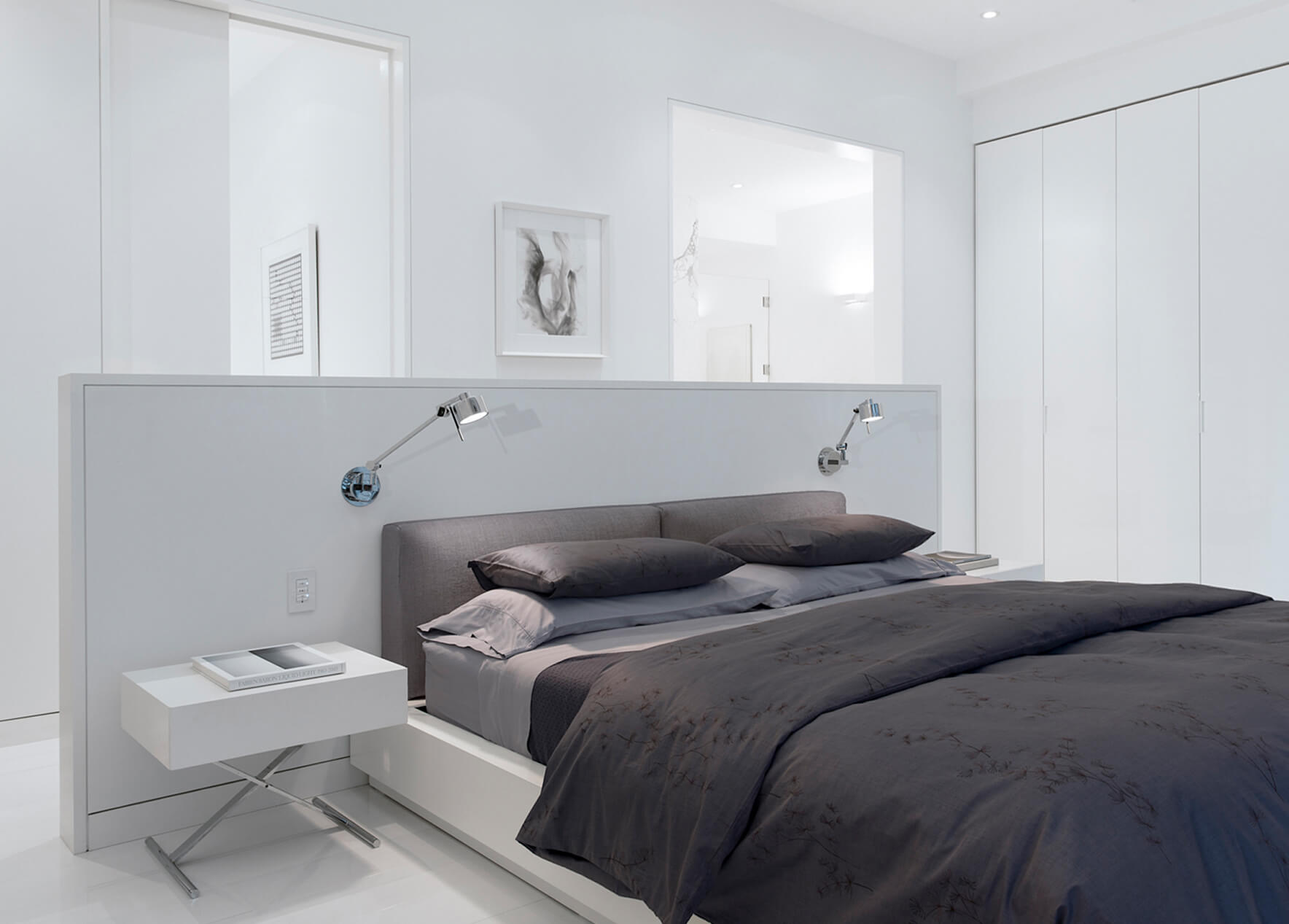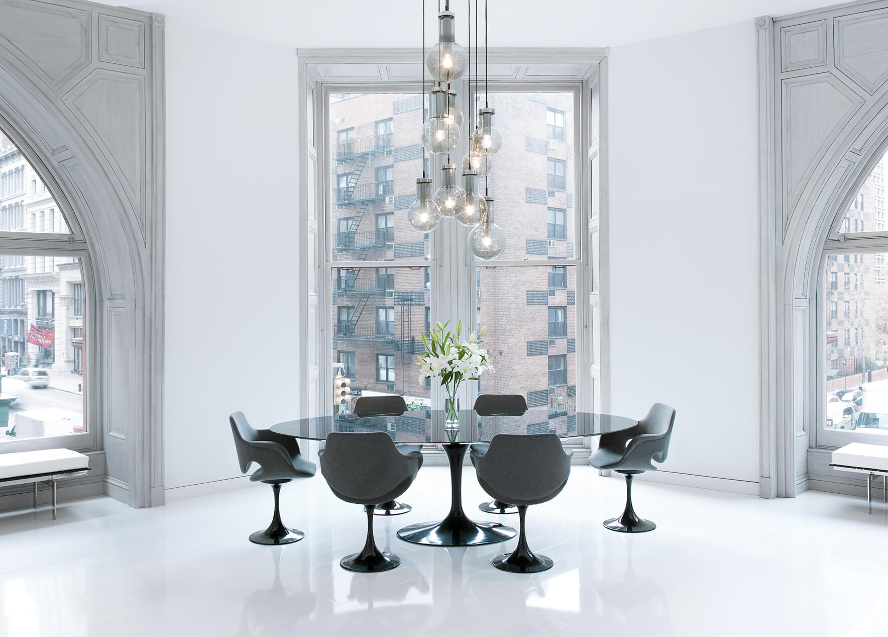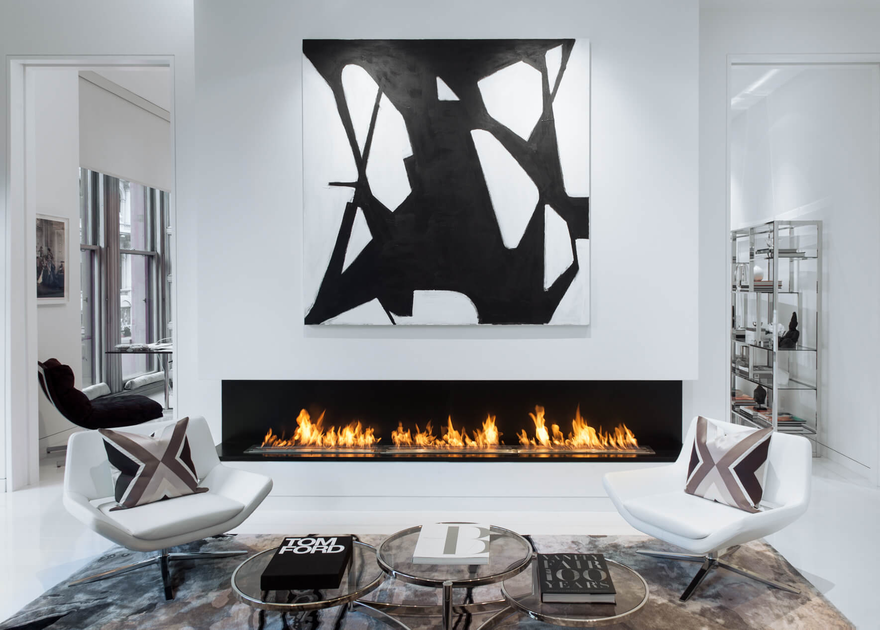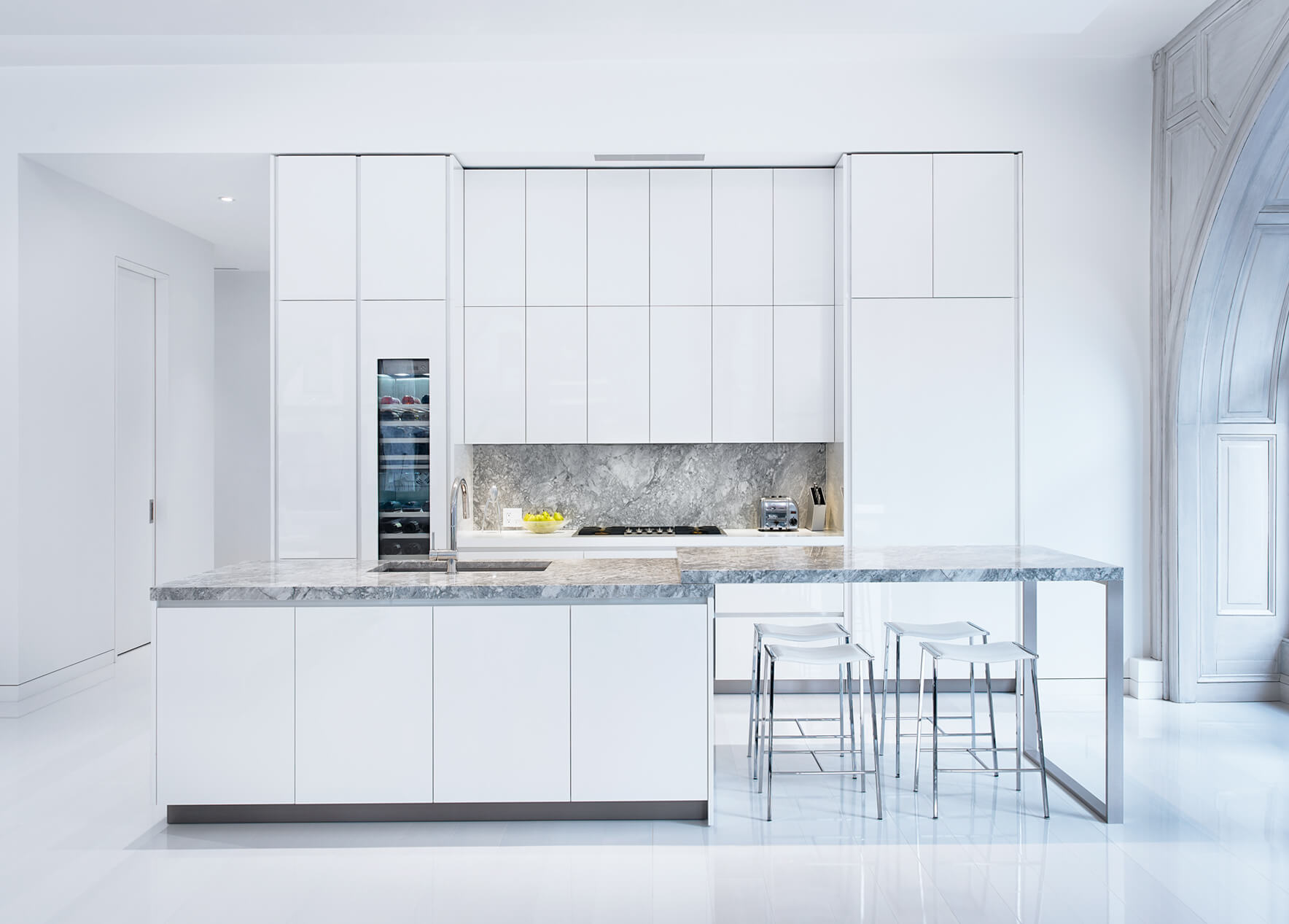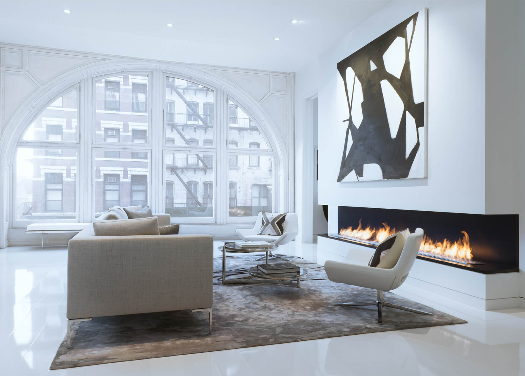 The main focus in the project was to restore the historic elements while creating a sleek 21st century environment for the modern day city dweller. The apartment required an entire gut renovation, demolishing the existing mezzanine spaces and creating a whole new layout. The visual feast of the exterior detailing on the Broadway and Bleecker Street facades translates into the loft’s original floor to ceiling wood arched windows. These were painstakingly restored whilst the 13’ high ceilings were reclaimed throughout. With these moves, DHD aimed to celebrate the building’s history and to bring the focus of the spaces back to loft’s incredible street views.