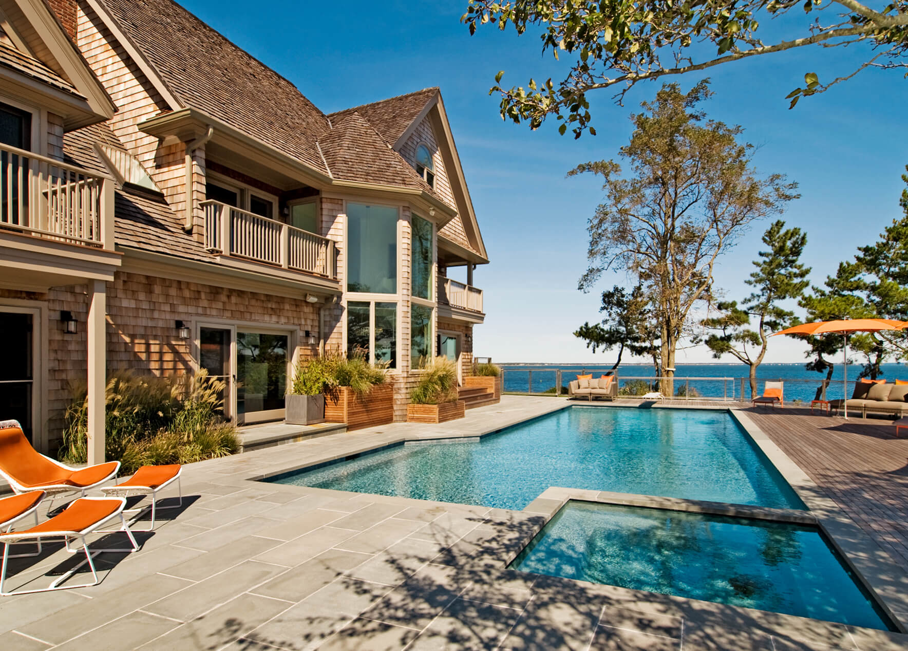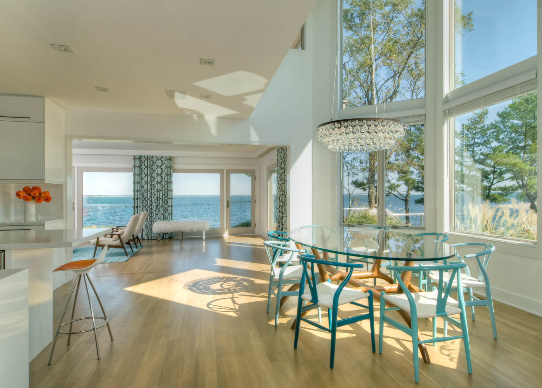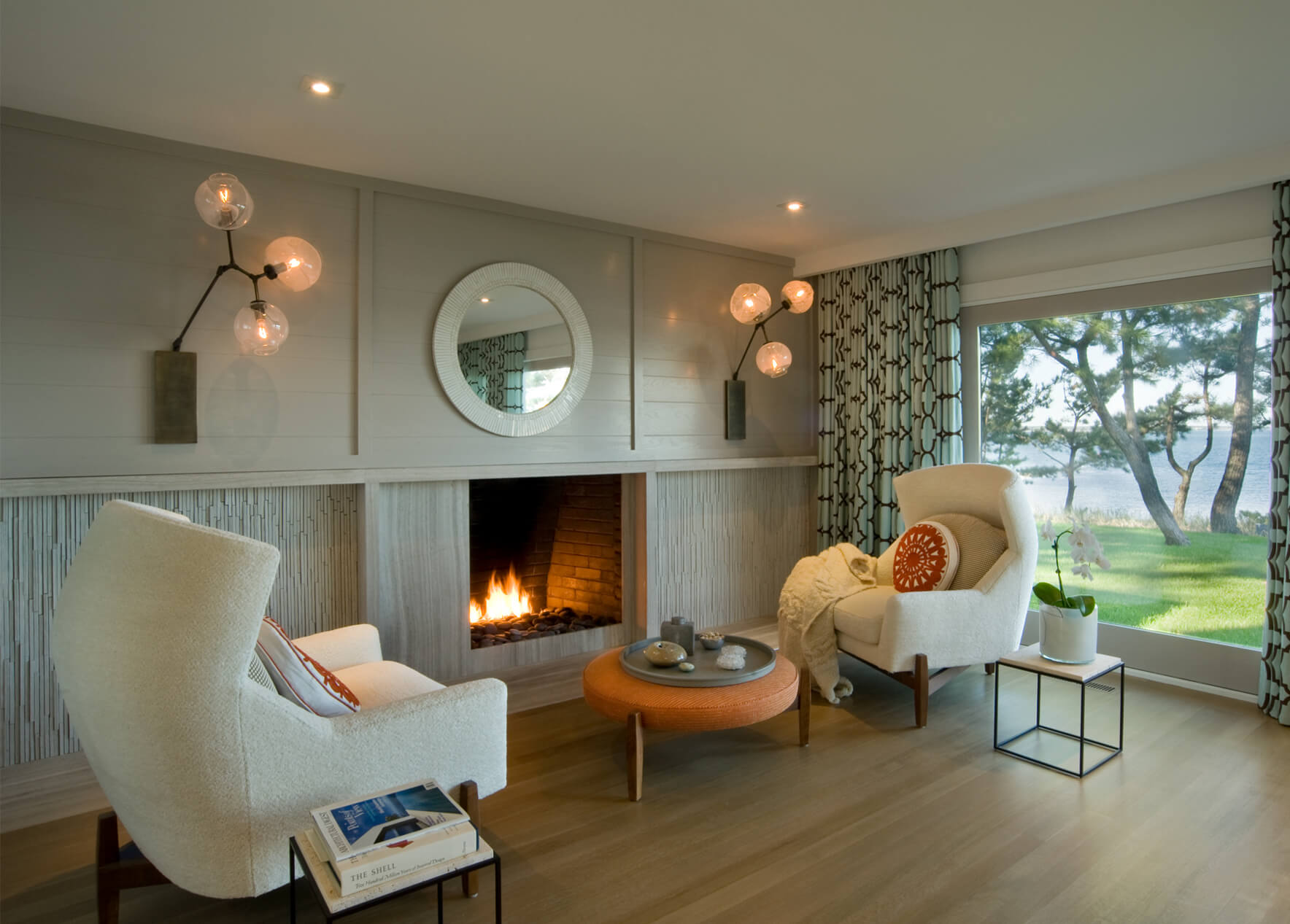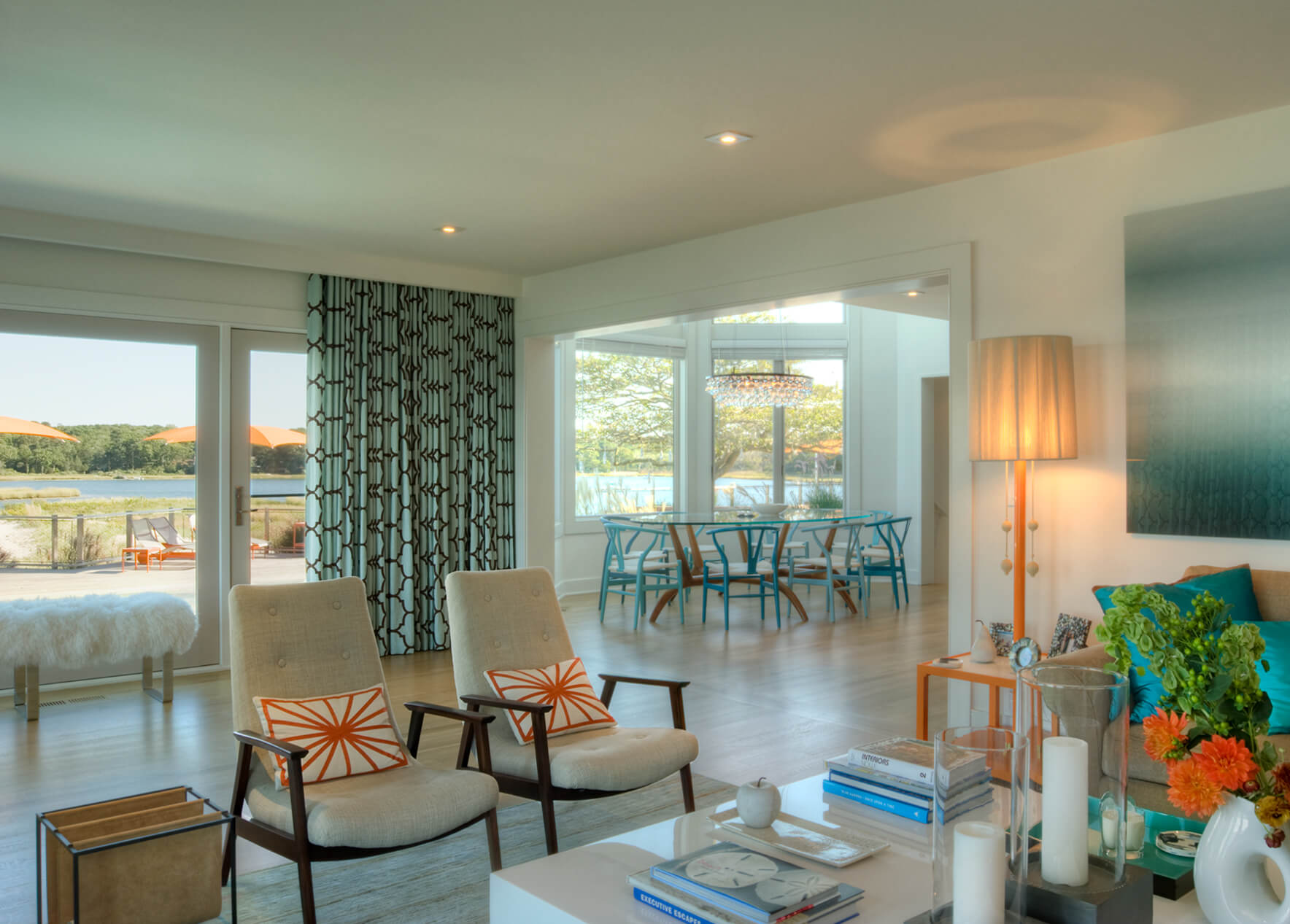 The interior’s traditional vernacular was replaced with more modern gestures, including simplified millwork and enlarged openings between rooms. Elements are designed to elongate the spaces and echo the horizon in the landscape. Expanses of slab stone or tile around fireplaces, in baths and in the kitchen introduce texture and color. A repeating palette of soft greys and whites, turquoise, and bright orange unifies the décor in an upbeat vein.