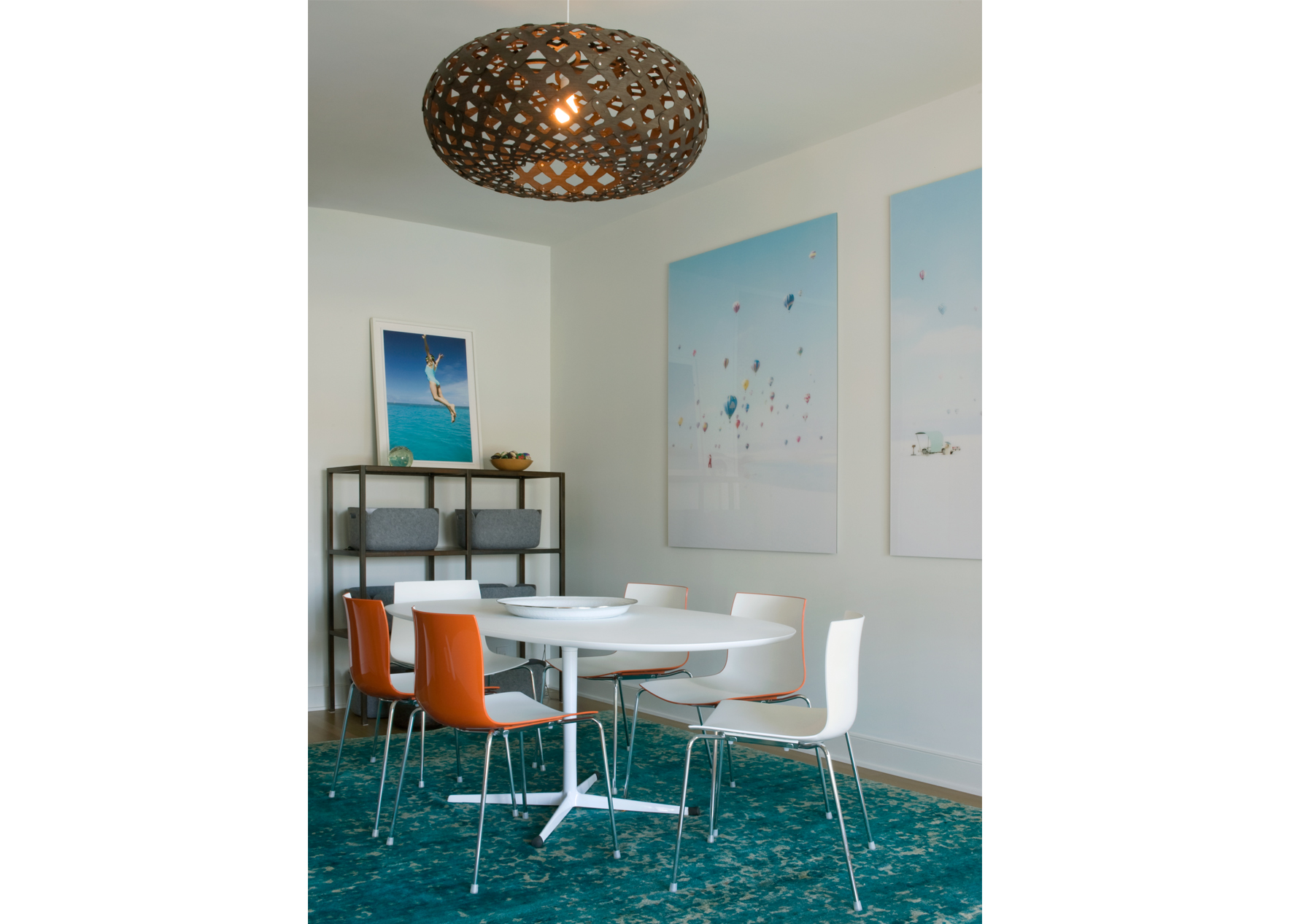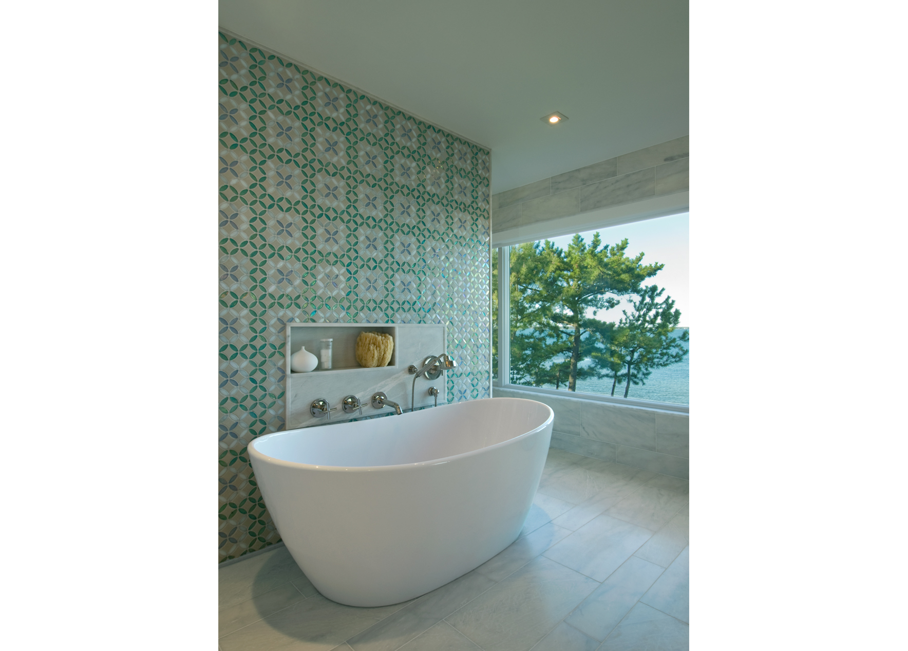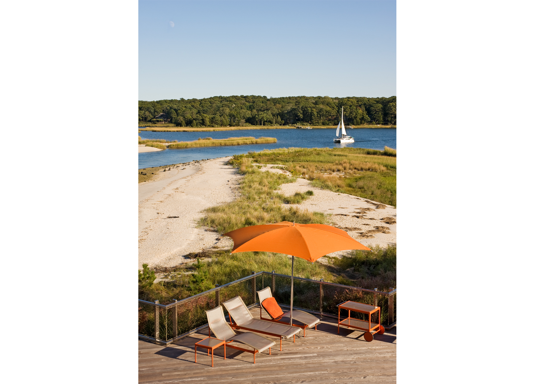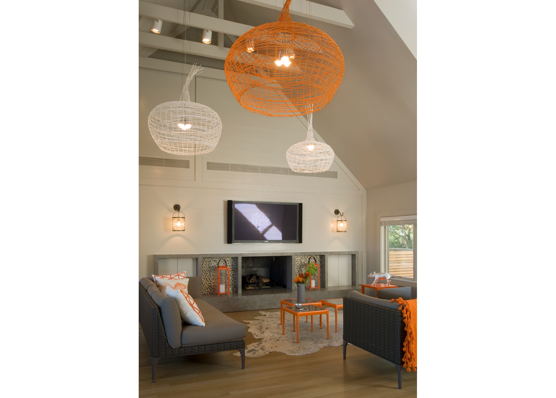 The interior’s traditional vernacular was replaced with more modern gestures, including simplified millwork and enlarged openings between rooms. Elements are designed to elongate the spaces and echo the horizon in the landscape. Expanses of slab stone or tile around fireplaces, in baths and in the kitchen introduce texture and color. A repeating palette of soft greys and whites, turquoise, and bright orange unifies the décor in an upbeat vein.