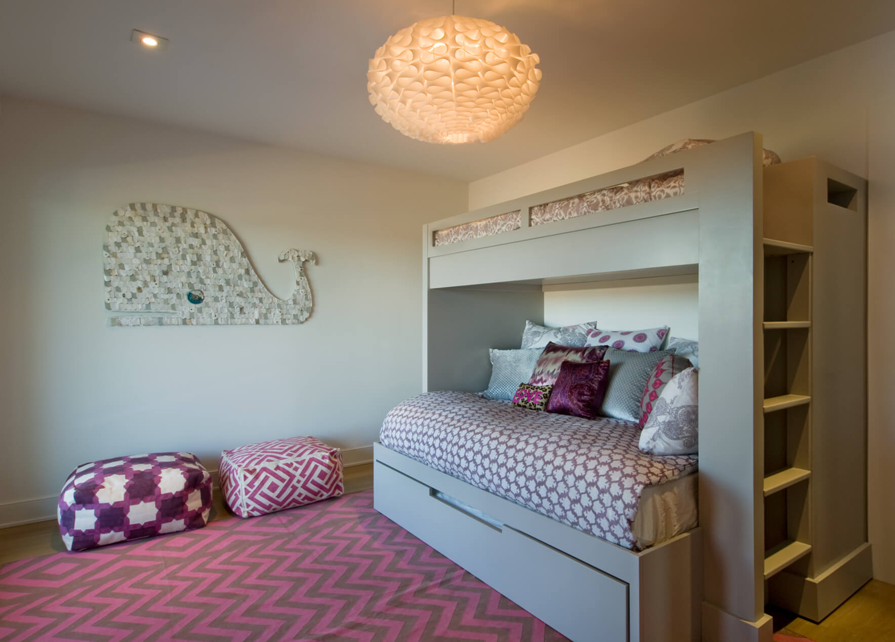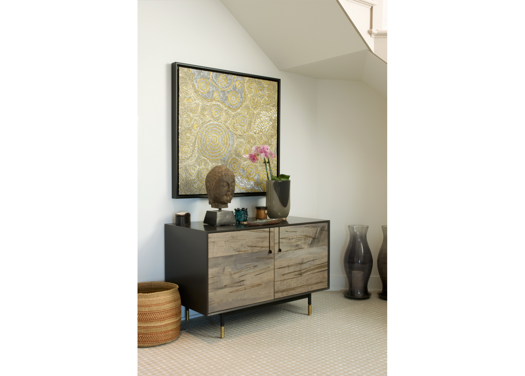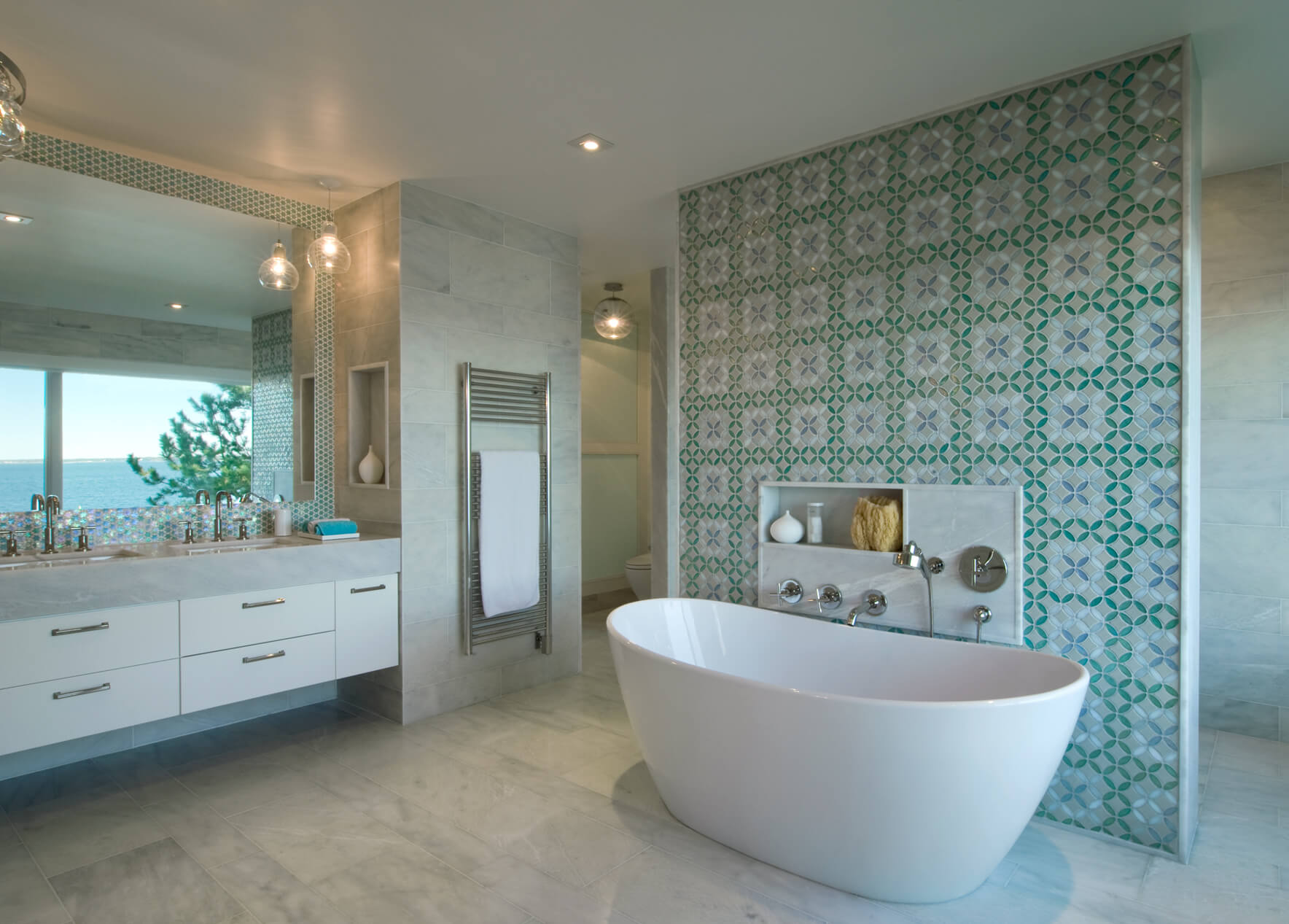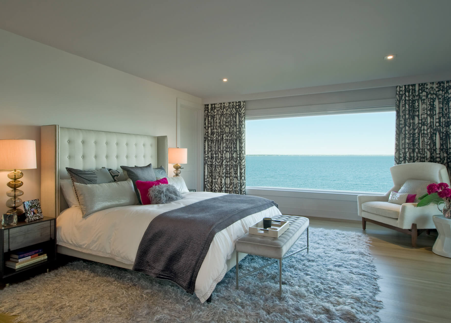 The interior’s traditional vernacular was replaced with more modern gestures, including simplified millwork and enlarged openings between rooms. Elements are designed to elongate the spaces and echo the horizon in the landscape. Expanses of slab stone or tile around fireplaces, in baths and in the kitchen introduce texture and color. A repeating palette of soft greys and whites, turquoise, and bright orange unifies the décor in an upbeat vein.