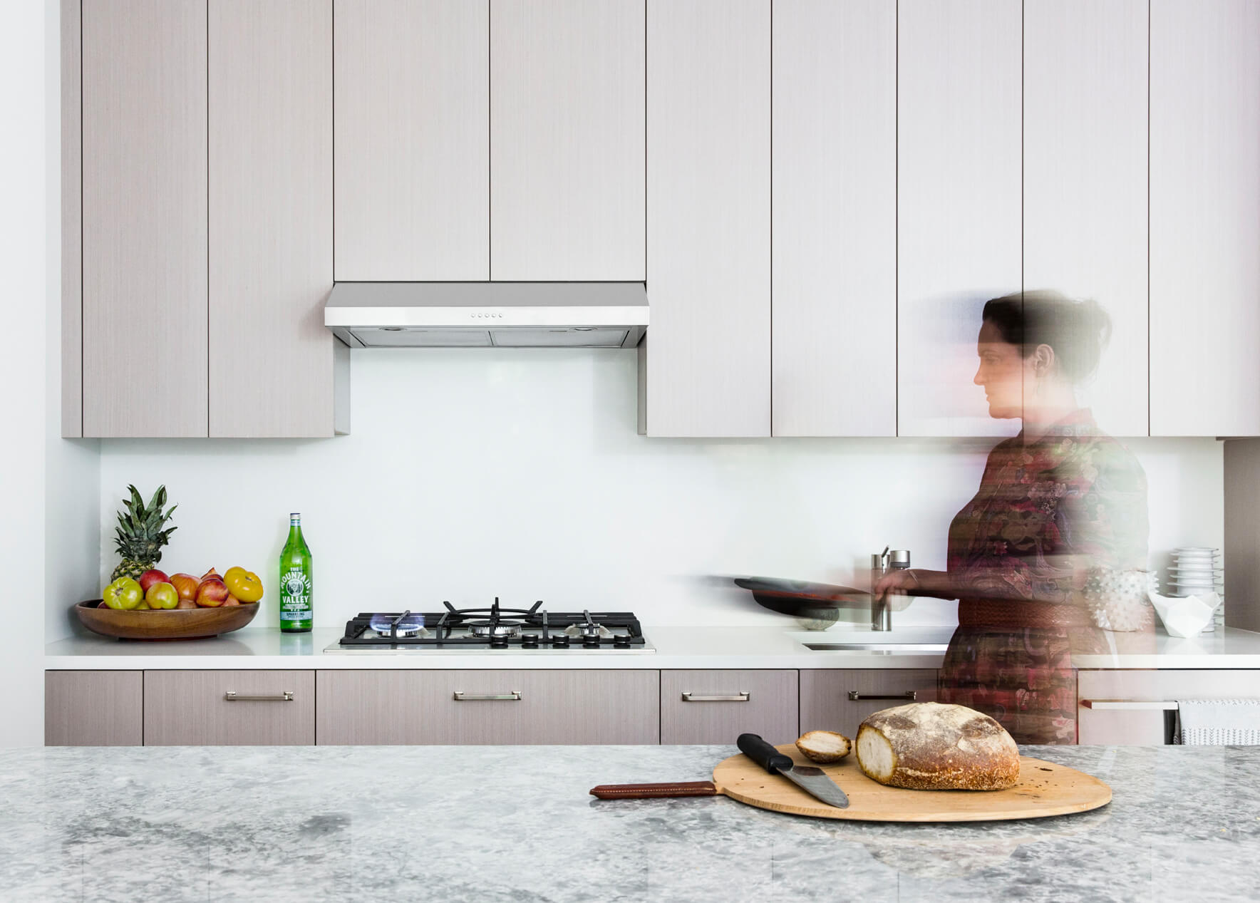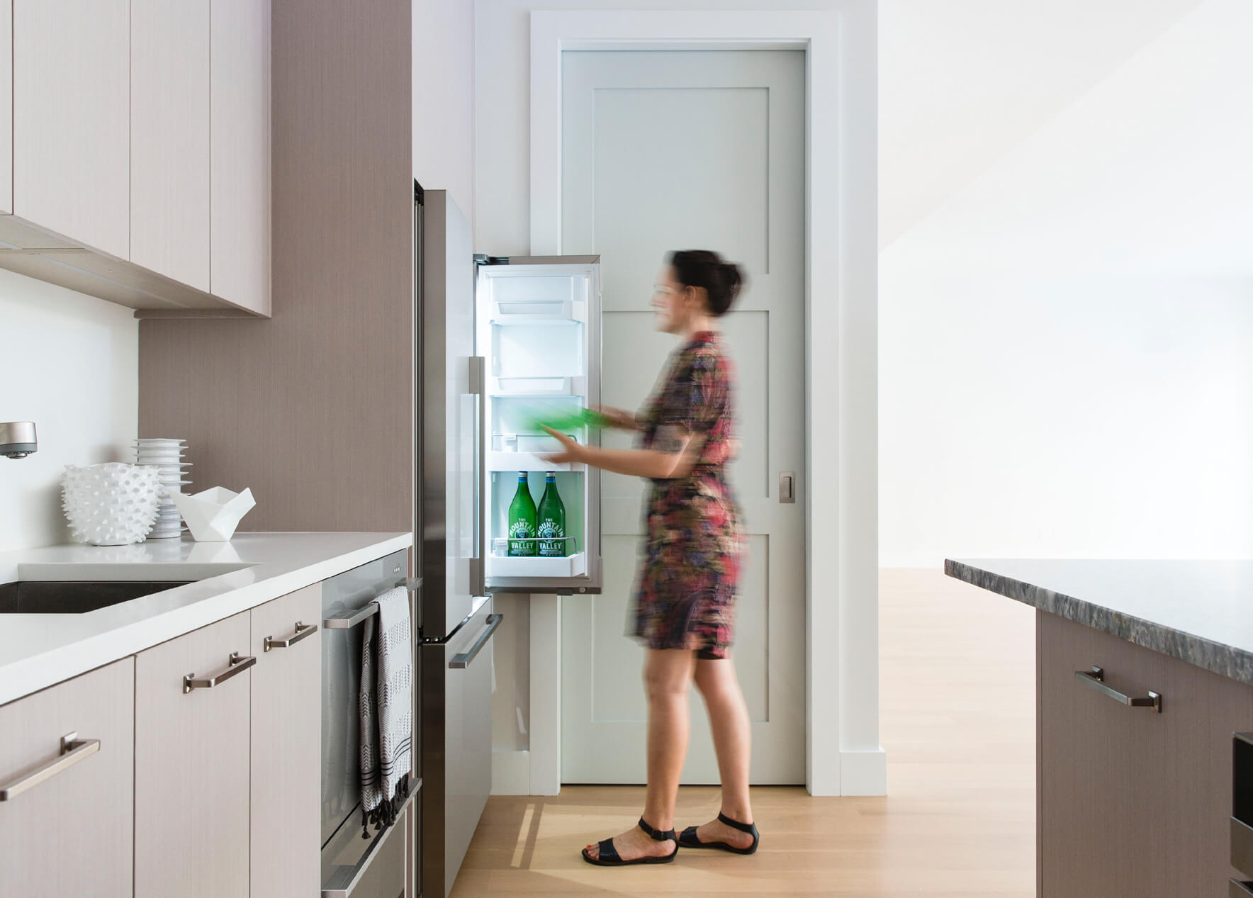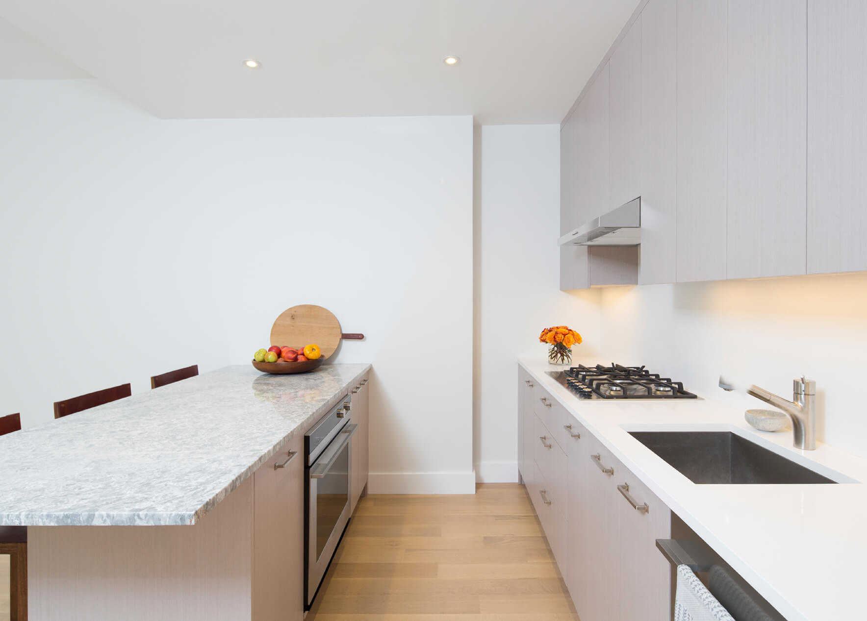 Oversized windows bring in ample light into the apartments that feature white oak wooden floors and marbled bathrooms with Kohler, Hansgrohe and Toto fixtures. Light colored open kitchen layouts complete the elegant, clean, modern look of the apartments.