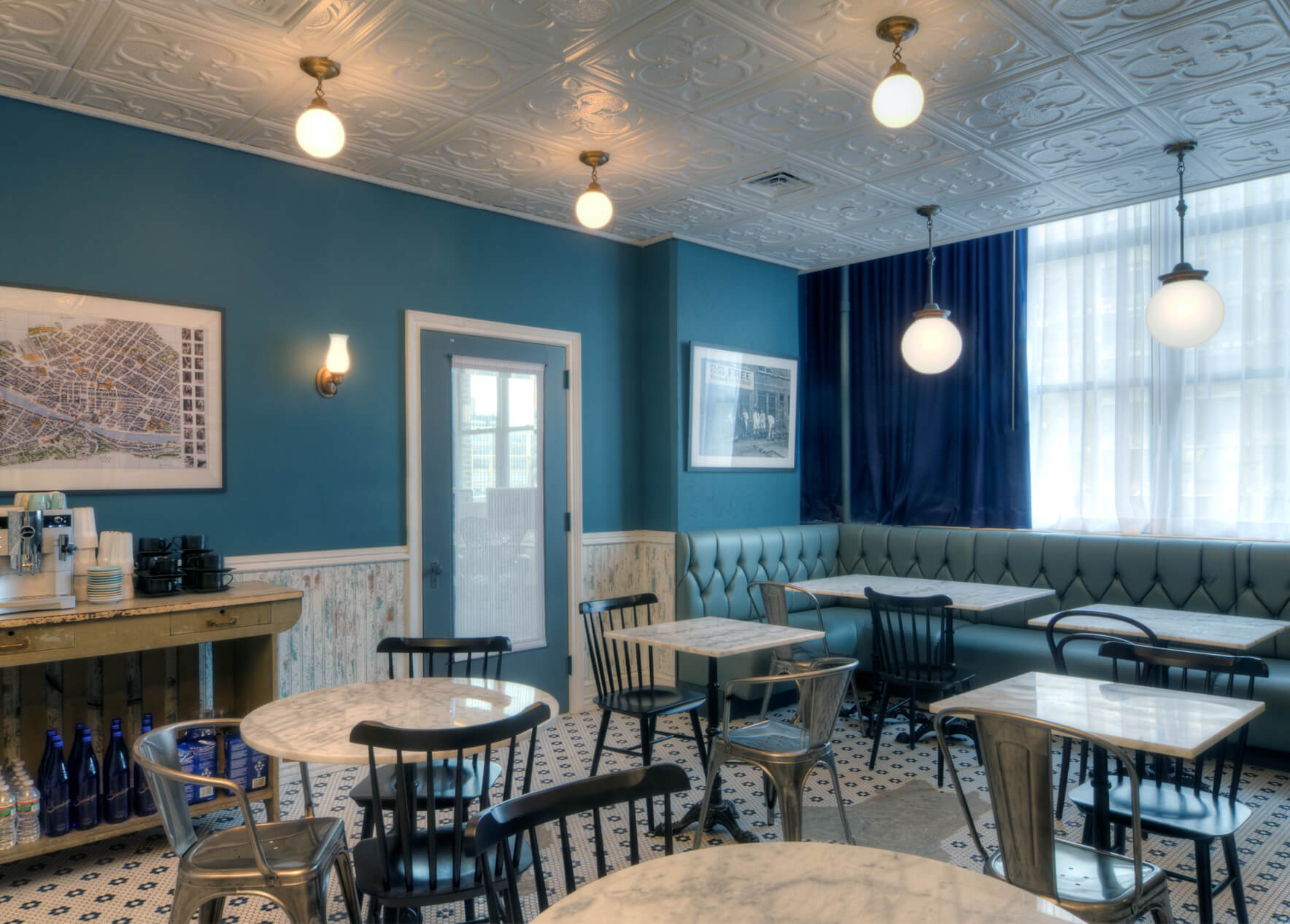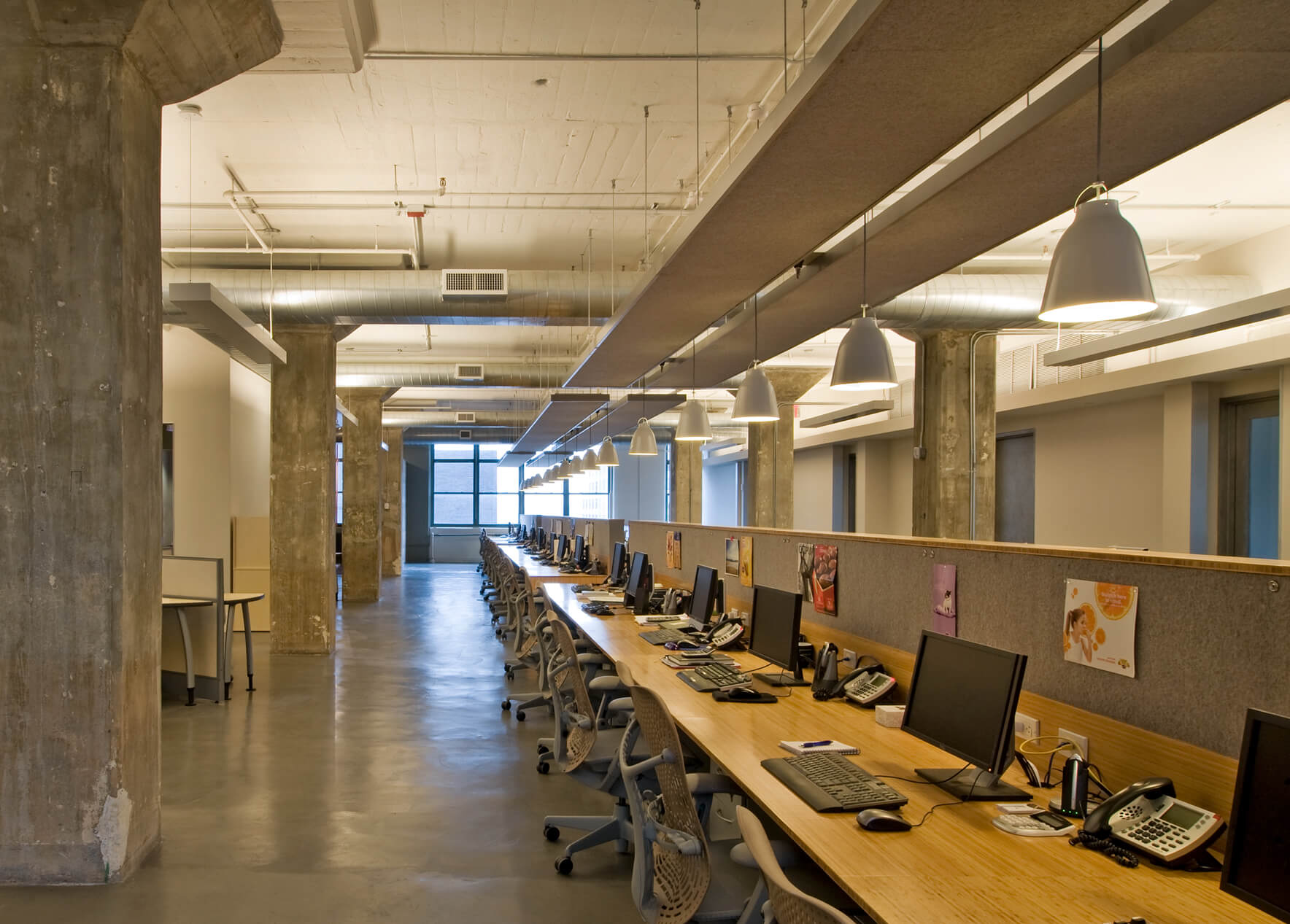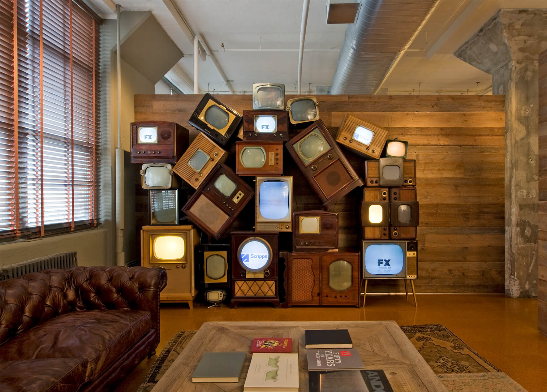 DHD created an open, “studio-like” work space with no visible hierarchy. The bright, airy studio space is designed with a single, continuous folding work surface running east to west, which anchors the studio, and contributes a human scale to the space. There are a variety of casual meeting spaces, each with a unique character, like a collection of stage or TV sets. Only one formal conference room exists and in it is an artist- installed rope ceiling. “Green” principles were employed throughout, and include vintage theatre seats, a feature wall of salvaged TV sets, reclaimed barn wood siding, the retention of various MEP systems, and the use of recycled or environmentally friendly finishes, furniture, and lighting.