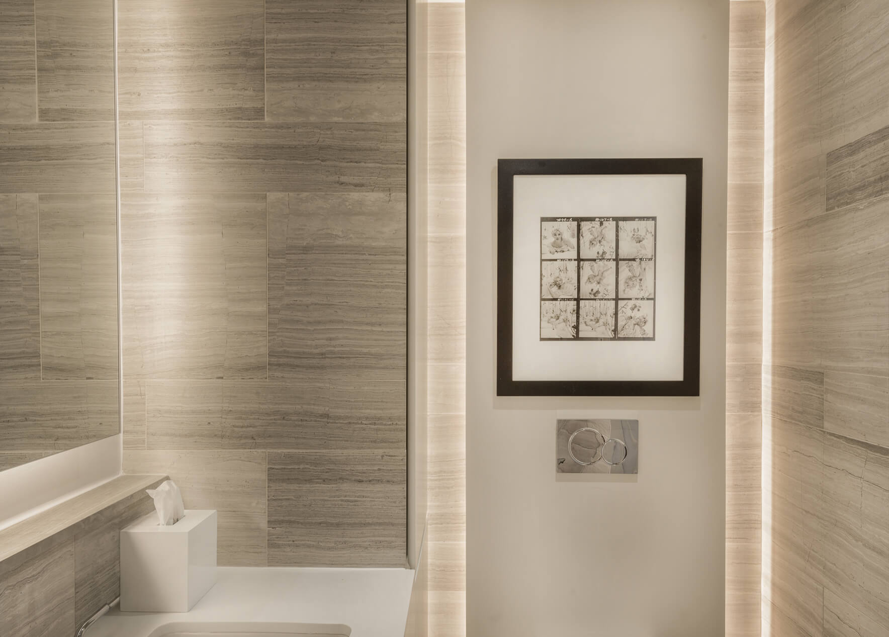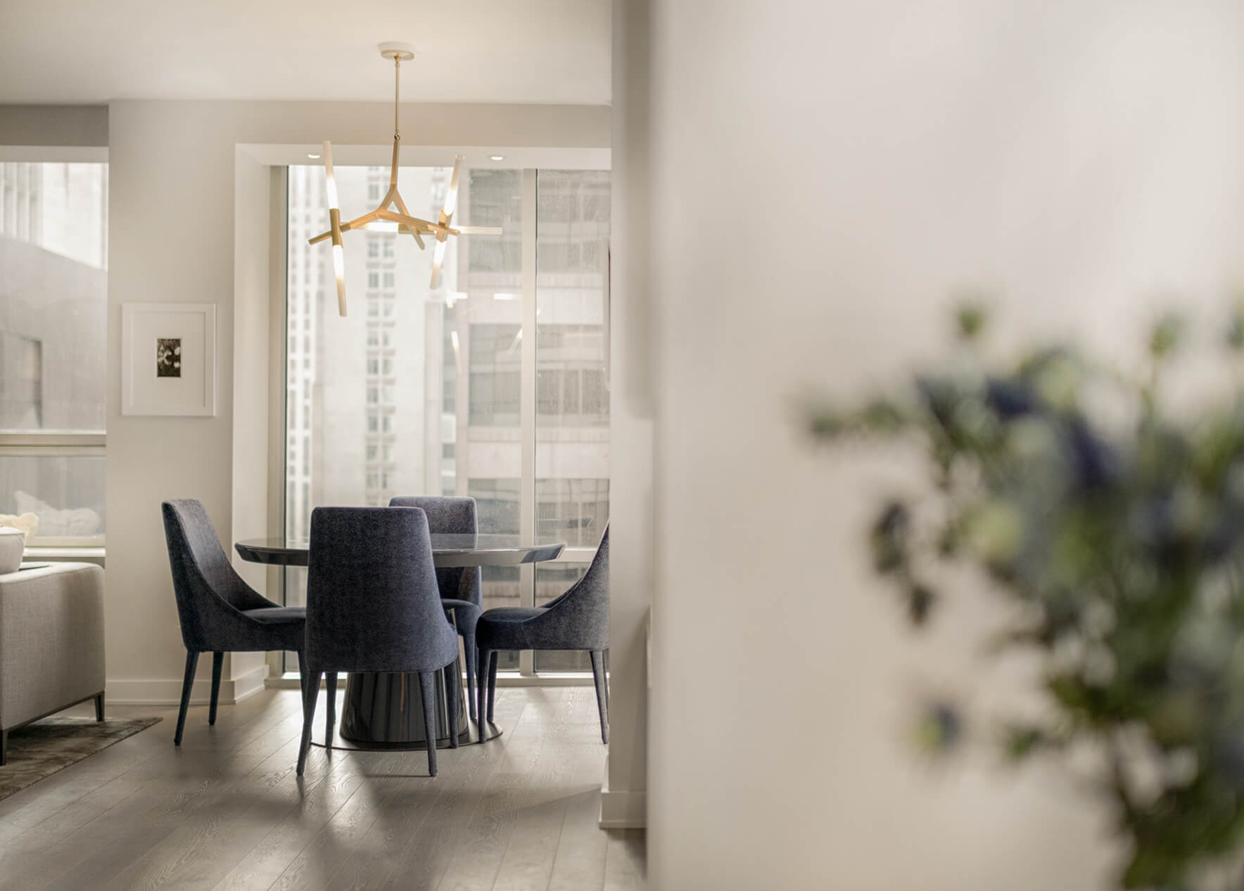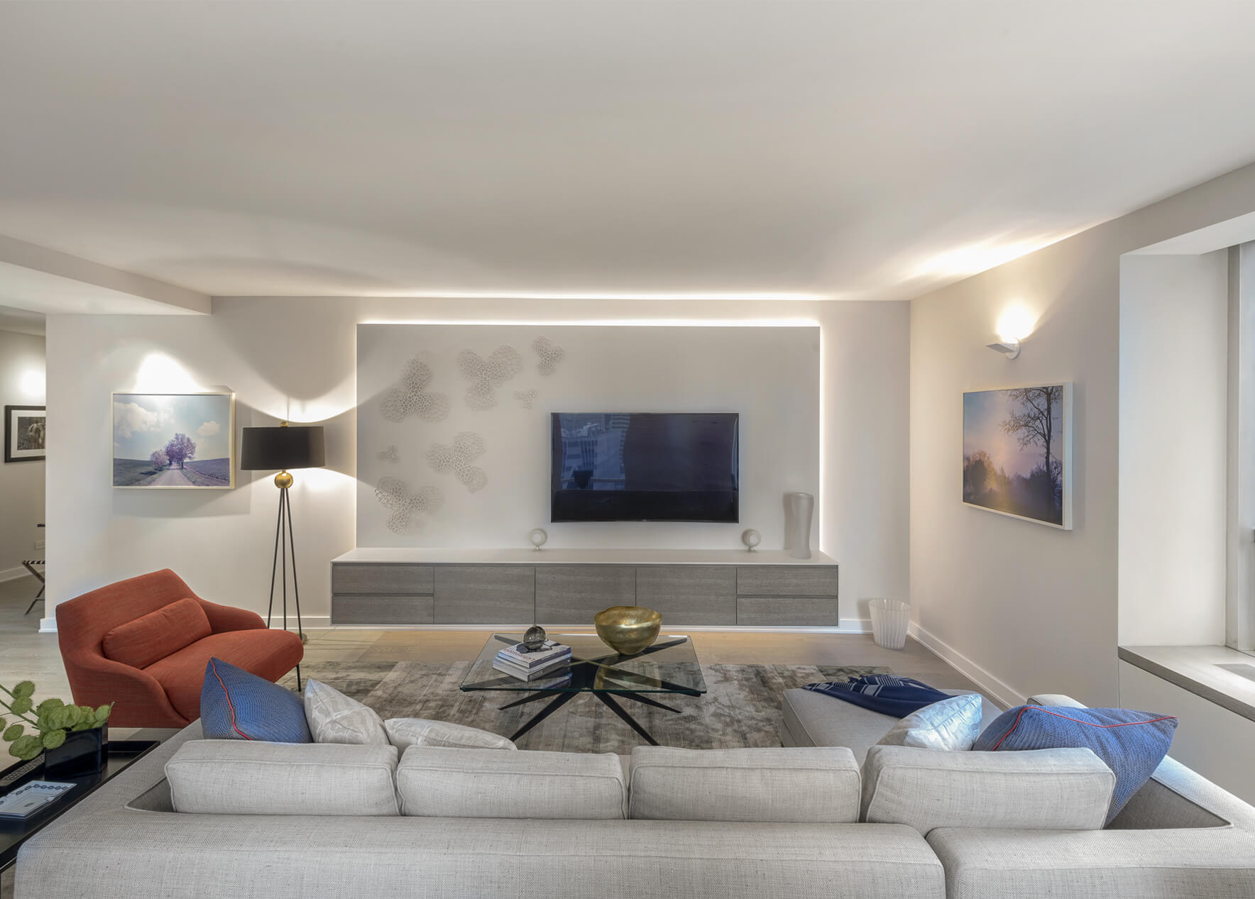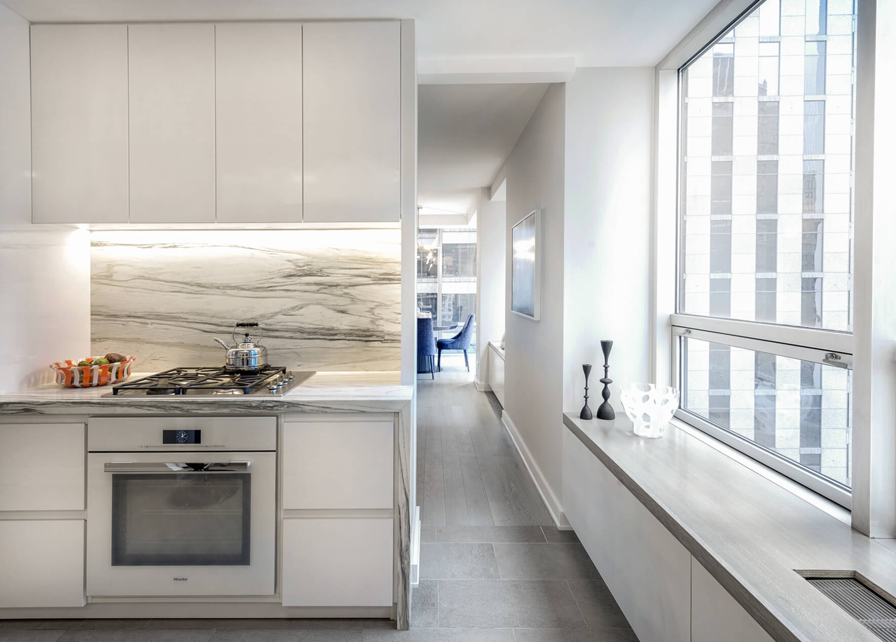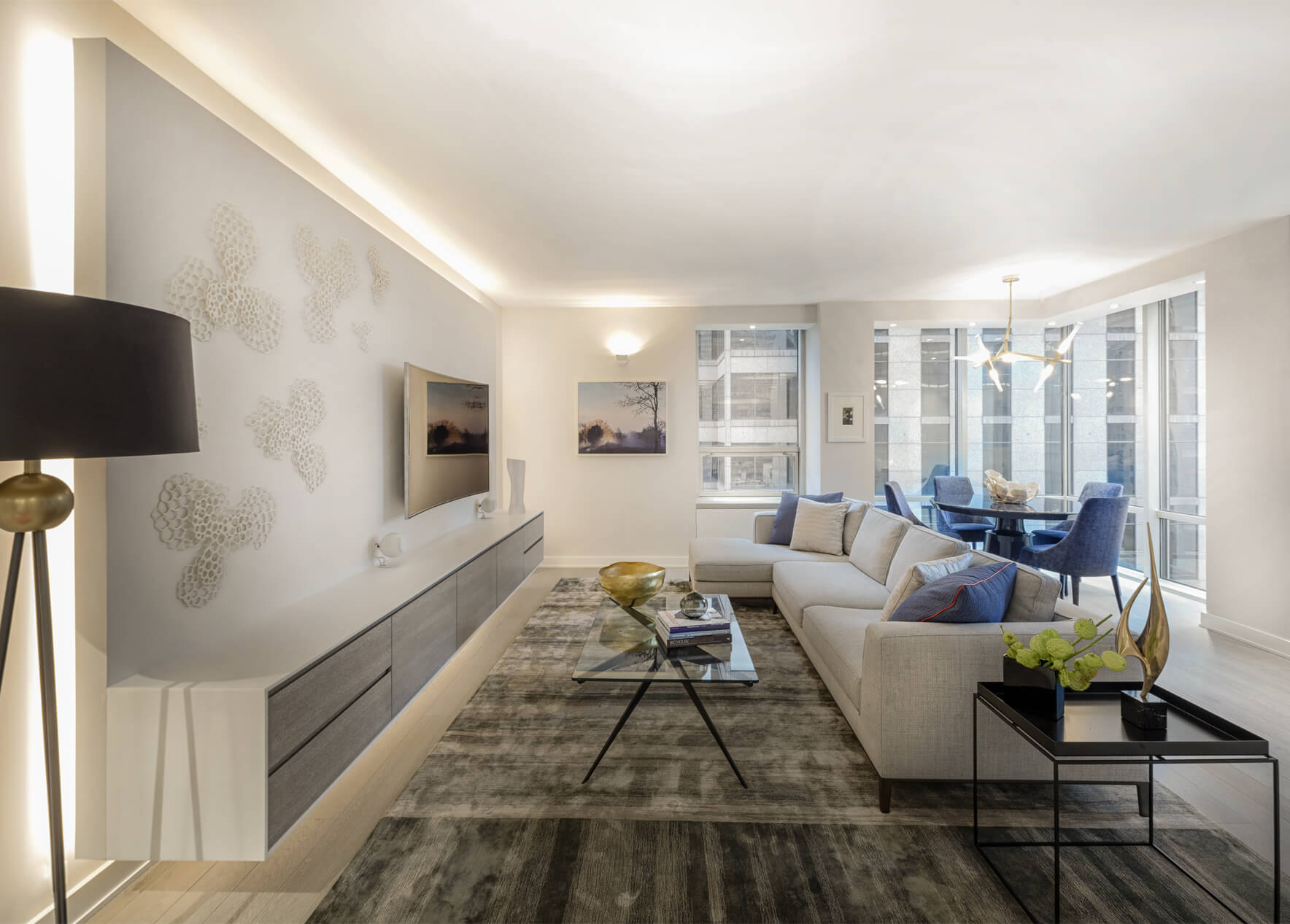 Centrally located in Manhattan, this stunning one bedroom MOMA Tower Residence received a gut renovation from our team. DHD Architecture created a bright, clean slate for a couple with impeccable taste. The strong urban landscape is visible from the floor to ceiling, with corner windows perched high above 5th Avenue. In addition, the minimally detailed custom mill work and architectural lighting lend itself to the view here.
