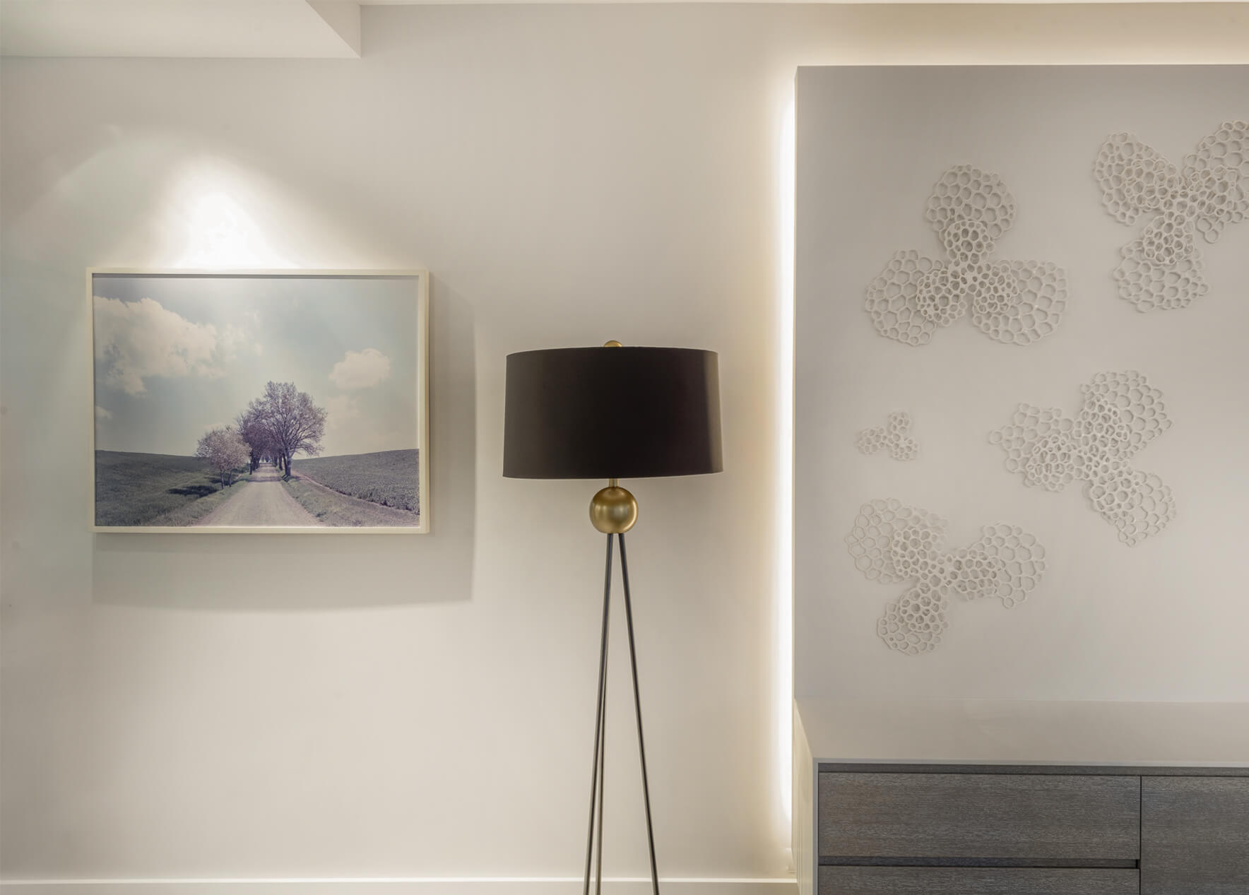 DHD Interiors kept lines sleek and sophisticated to compliment the decor’s streamline setting. The classic neutral palette combined with bold, modern furniture and a chic array of accessories creates the perfect backdrop for the clients’ expertly curated art collection.