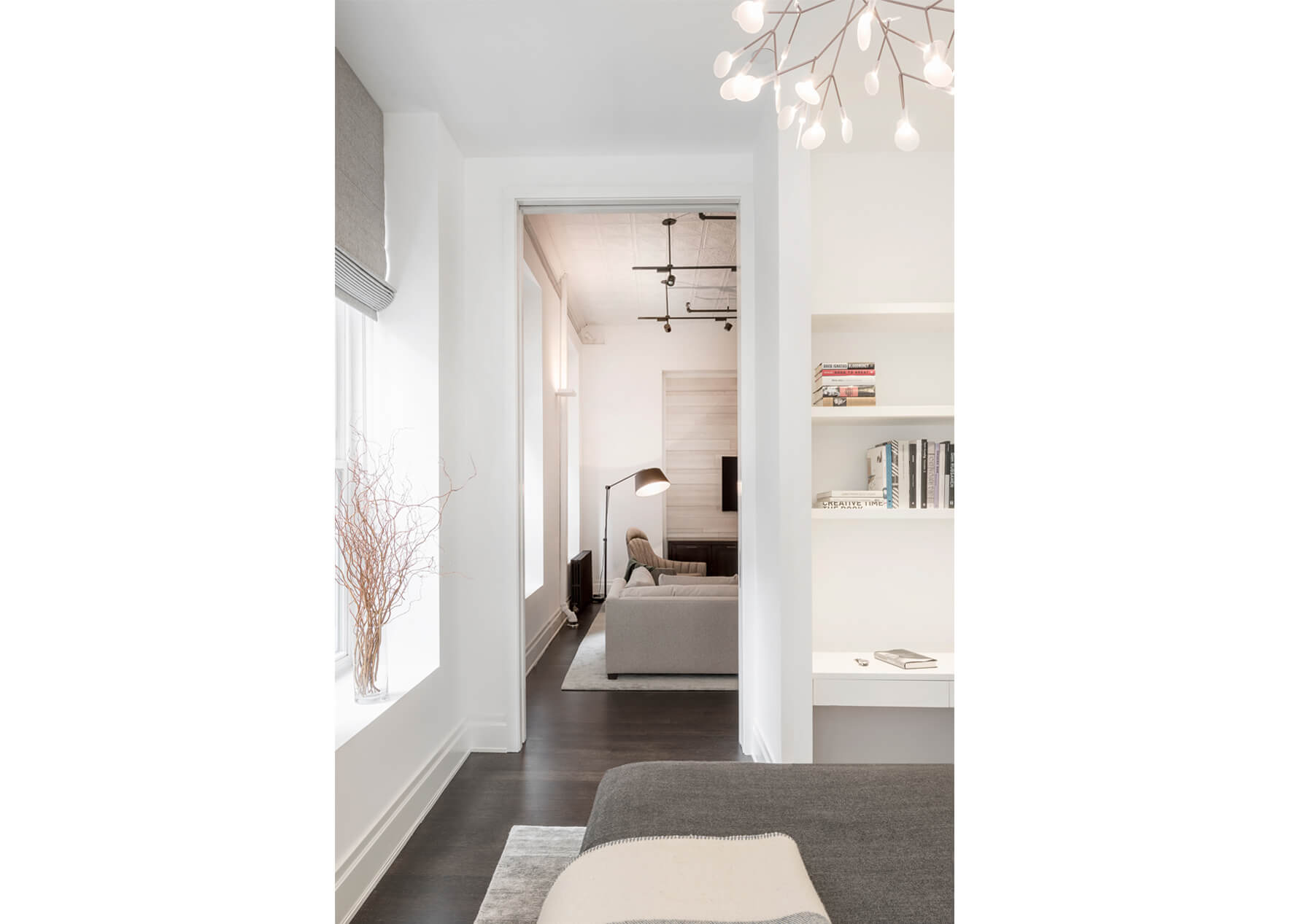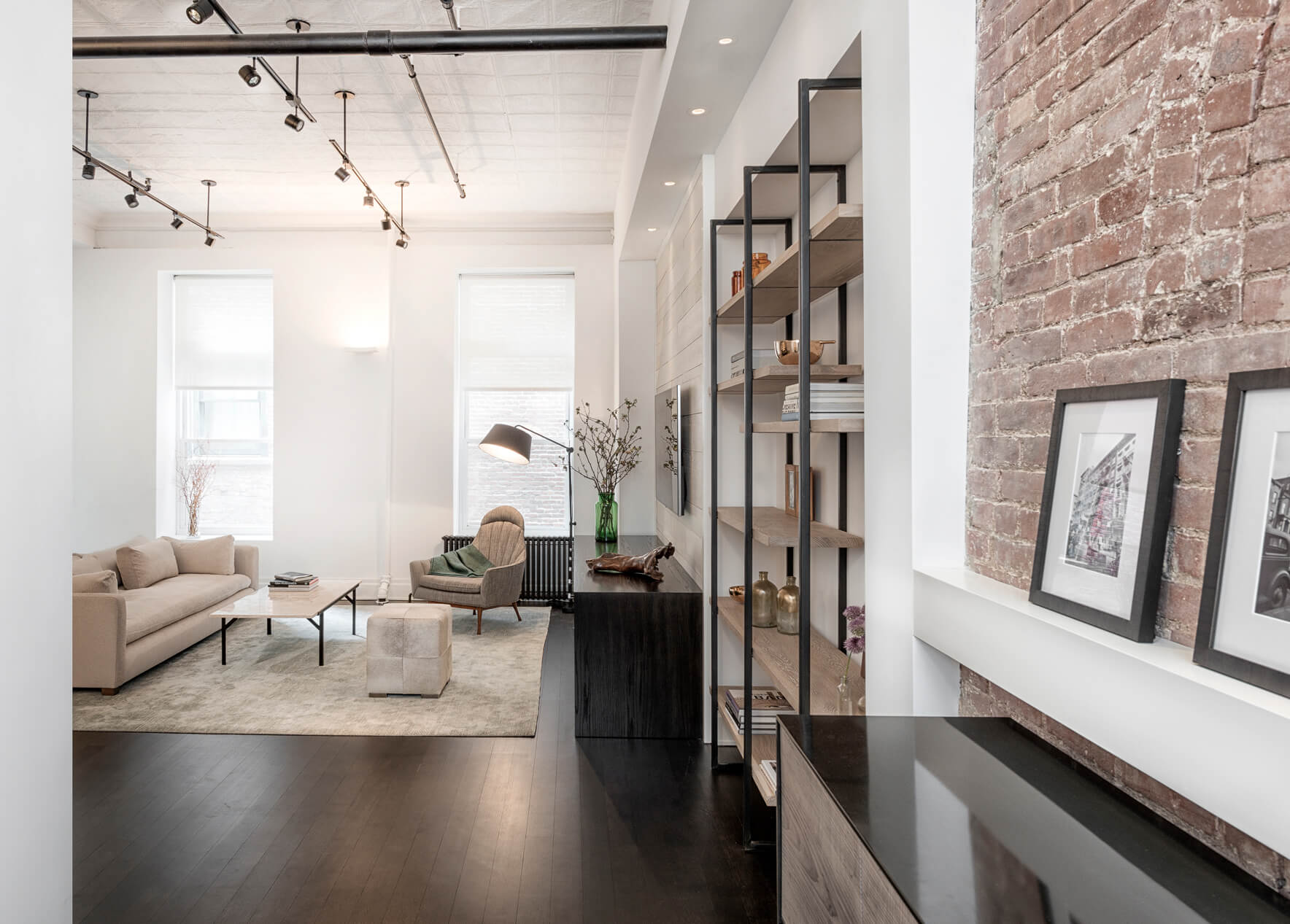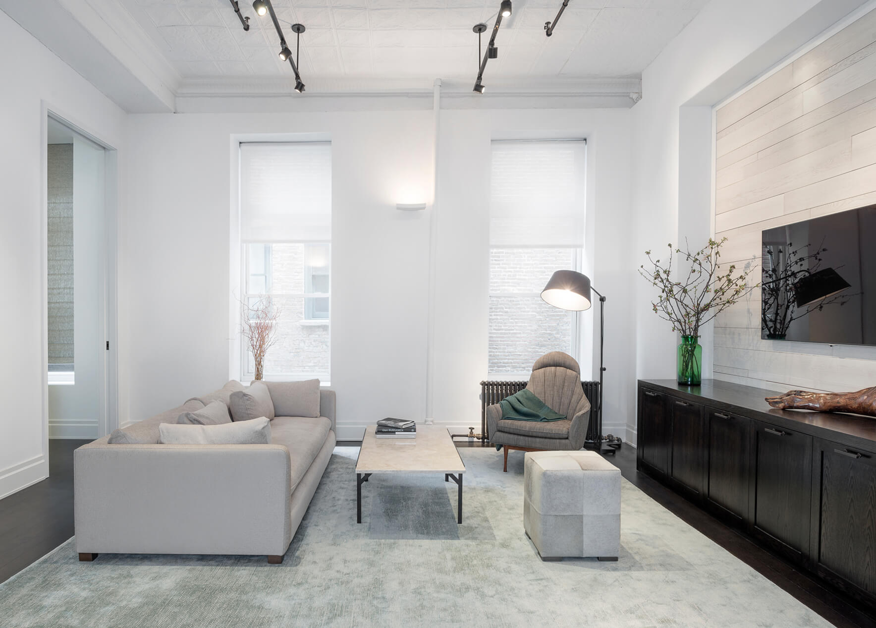 This loft was a gut renovation of a two-bedroom loft in a landmark building in the heart of Soho, NYC. Each floor of this building, which had been used to process molasses until in the 1890s, was sloped toward a large central drain designed to evacuate waste. To remedy this issue, we elevated and leveled the floors throughout the apartment. All new plumbing, electrical, HVAC, and rift white oak flooring were installed.