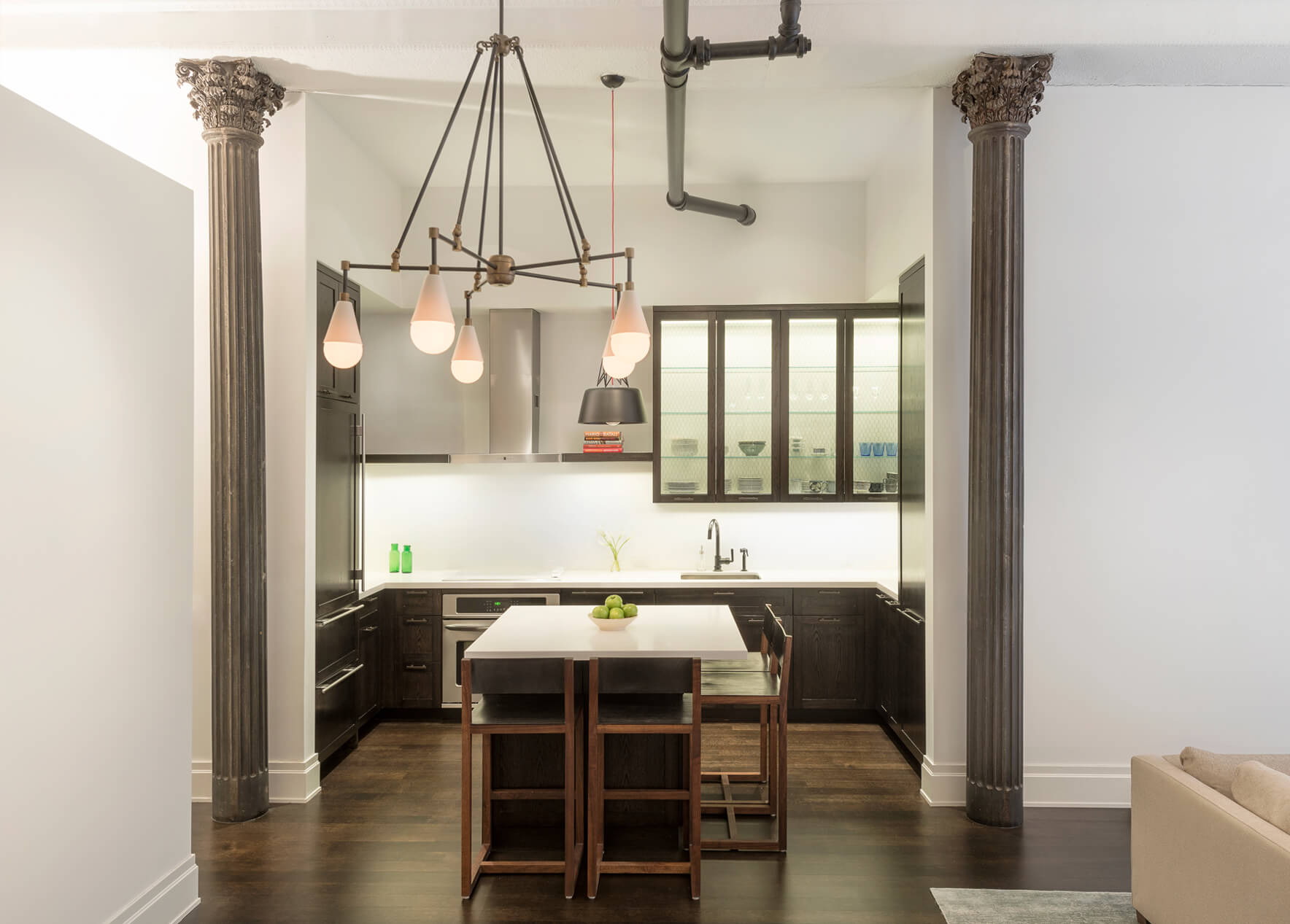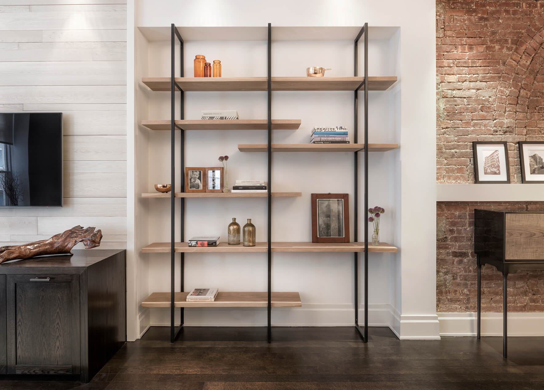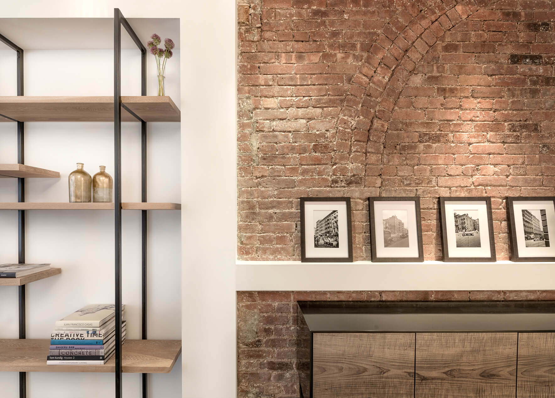 This loft was a gut renovation of a two-bedroom loft in a landmark building in the heart of Soho, NYC. Each floor of this building, which had been used to process molasses until in the 1890s, was sloped toward a large central drain designed to evacuate waste. To remedy this issue, we elevated and leveled the floors throughout the apartment. All new plumbing, electrical, HVAC, and rift white oak flooring were installed.