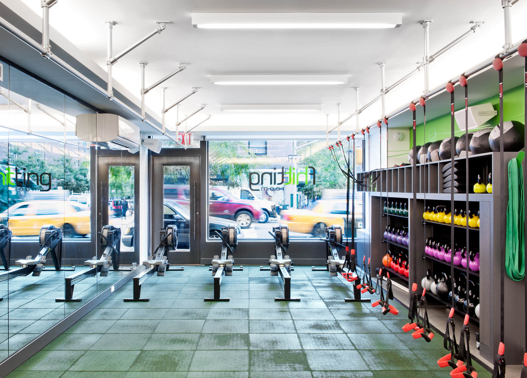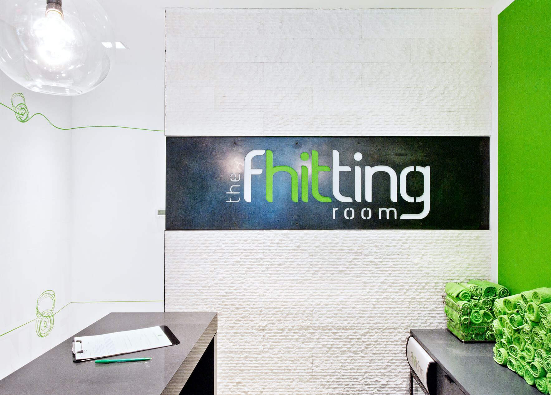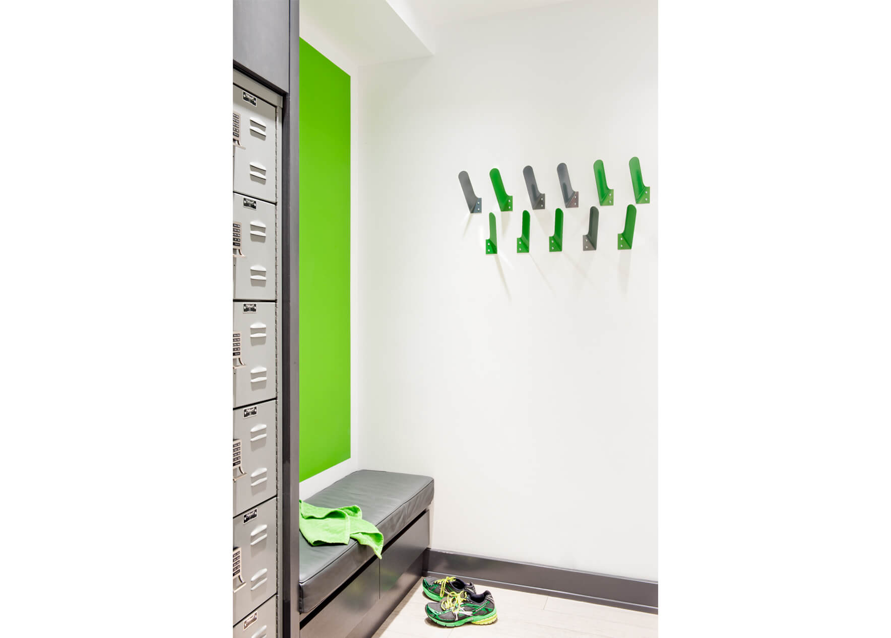 Branding elements abound, with Fhitting Room’s signature lime green and grey appearing on everything from the signage and custom graphics in the entry to the coat and equipment hooks. The energetic and cheerful design fits a lot of program into a small but functional space. The Fhitting Room is a High Intensity Training (HIT) boutique fitness studio offering small classes taught by renowned instructors. Workouts are intense and challenging yet exciting and fun.