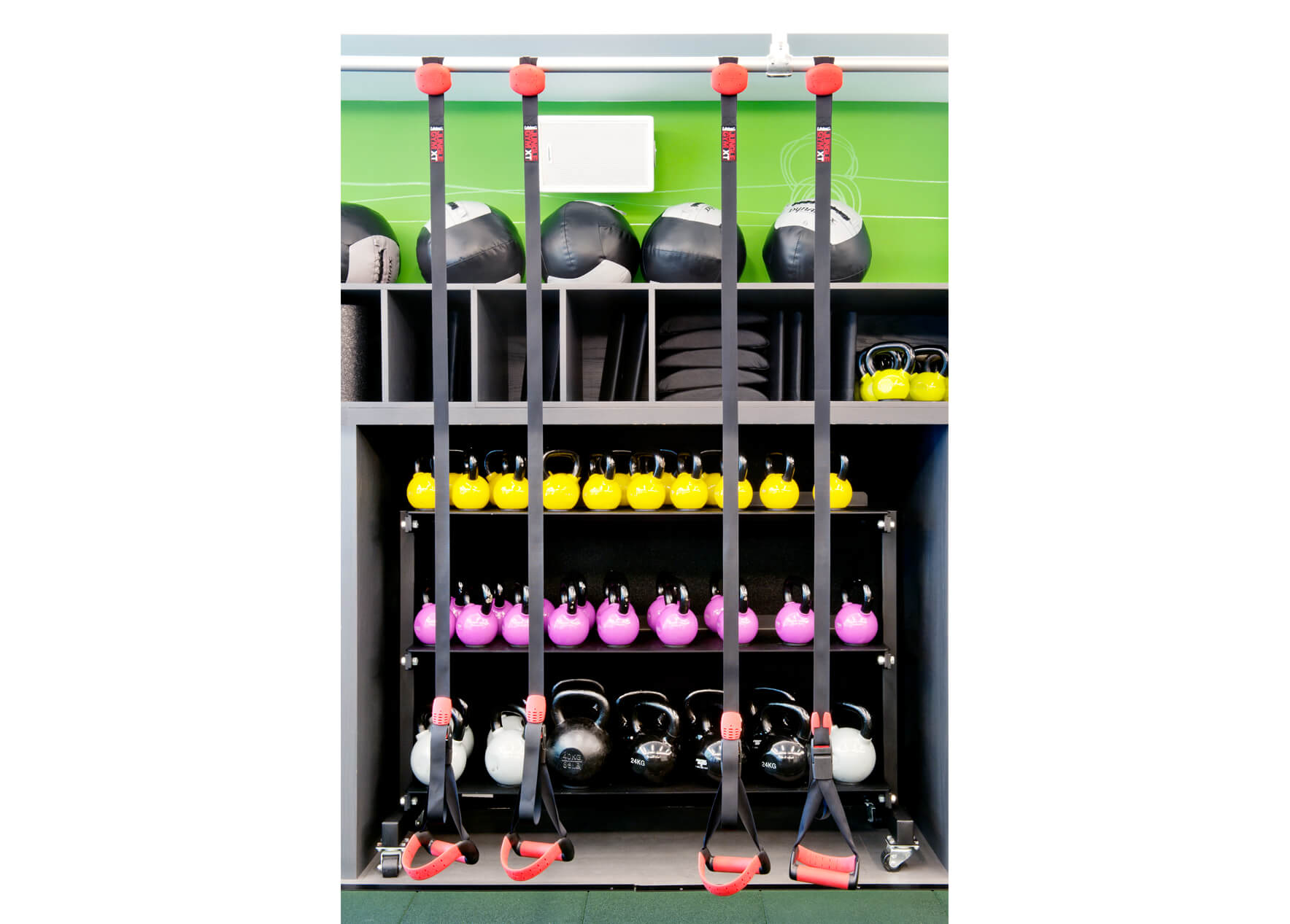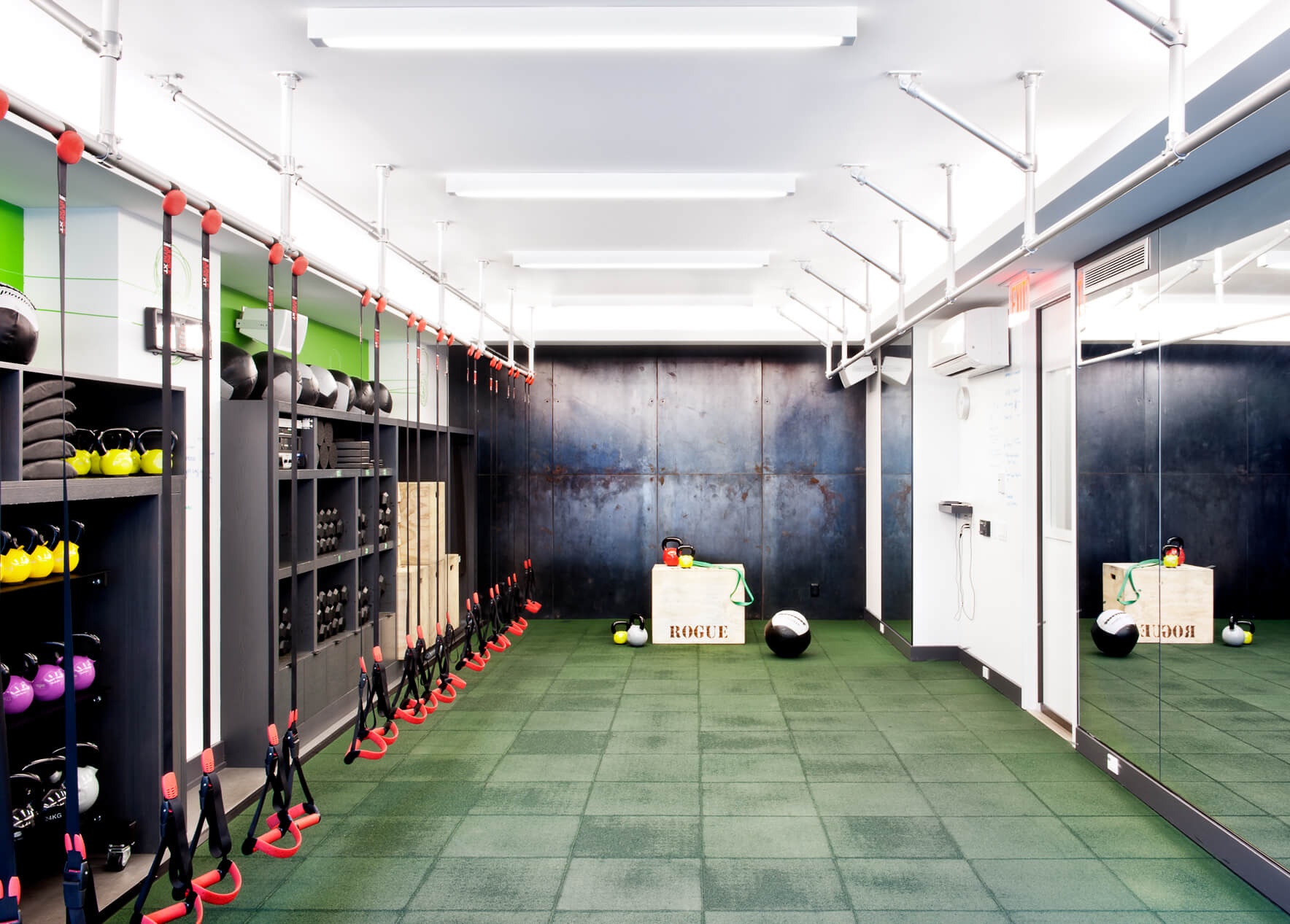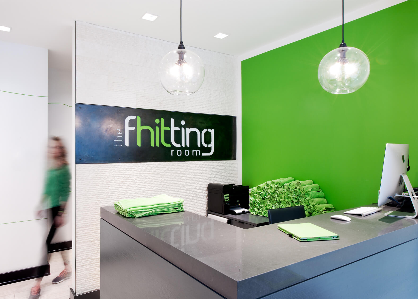 Branding elements abound, with Fhitting Room’s signature lime green and grey appearing on everything from the signage and custom graphics in the entry to the coat and equipment hooks. The energetic and cheerful design fits a lot of program into a small but functional space. The Fhitting Room is a High Intensity Training (HIT) boutique fitness studio offering small classes taught by renowned instructors. Workouts are intense and challenging yet exciting and fun.